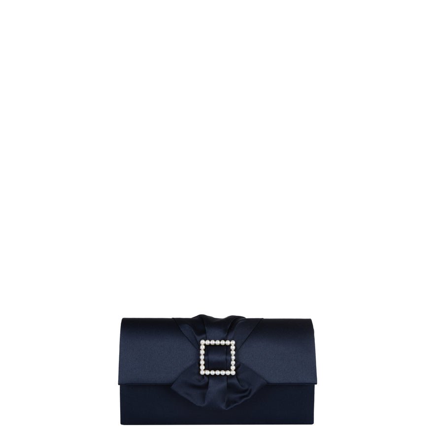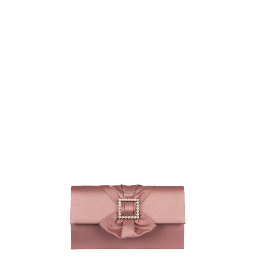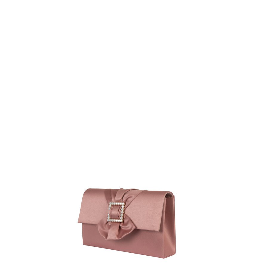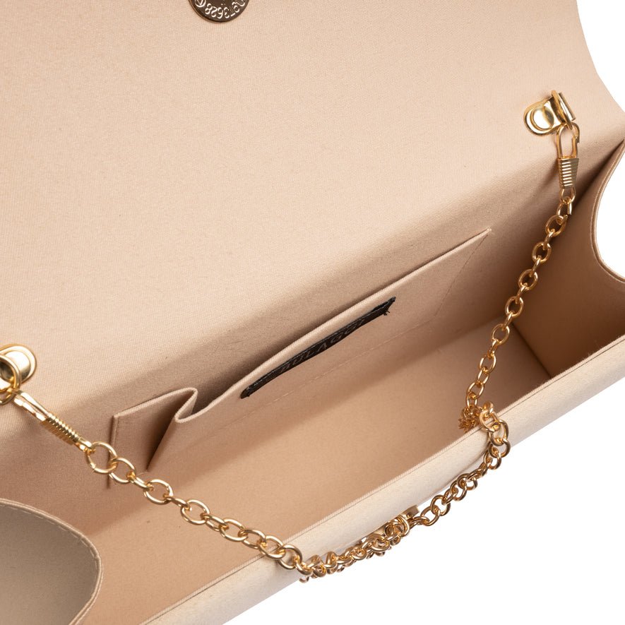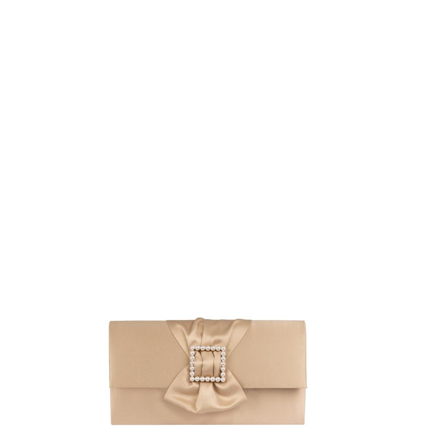 This feminine envelope Bow is a large clutch that fits many essentials for a night out. This bag can also be worn over the shoulder thanks to the included extra shoulder strap. On the inside, this bag has a main compartment with one inner pocket. The metal color is light gold. The dimensions (width / height / depth) of this envelope are 23x12x4