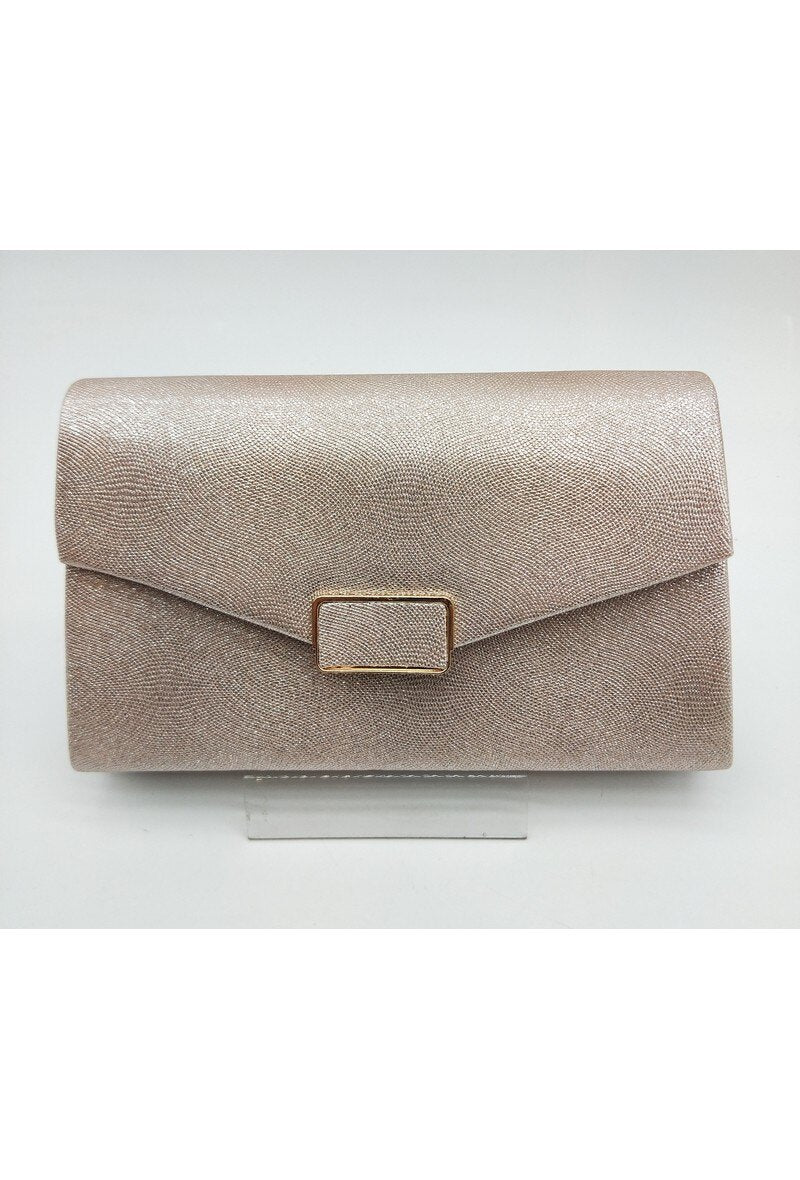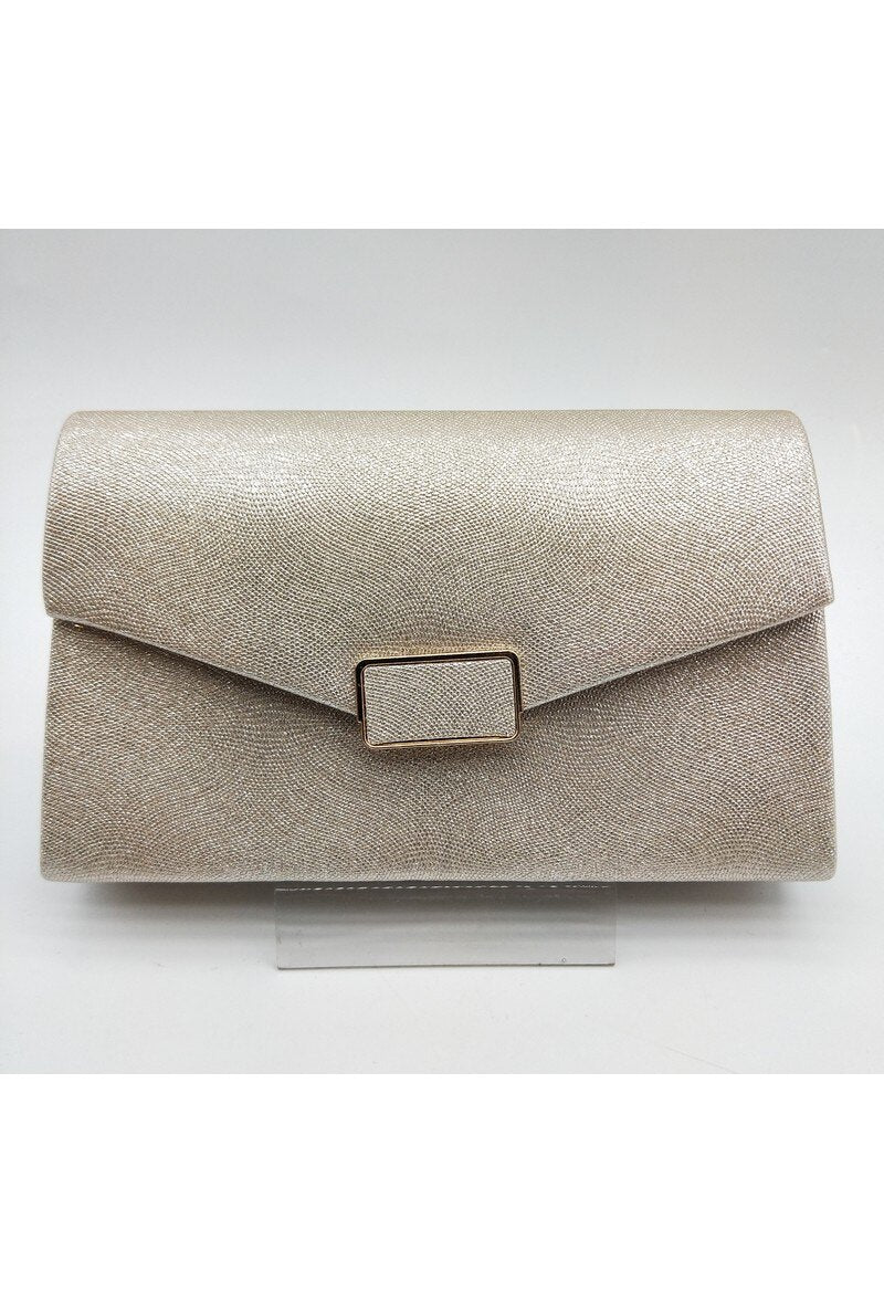 Deze elegante avondclutch straalt klasse en verfijning uit. De tas is uitgevoerd in een subtiel glanzend materiaal met een fijne structuur en wordt stijlvol afgewerkt met een rechthoekige metalen gesp op de klep, wat zorgt voor een tijdloze en luxe uitstraling.