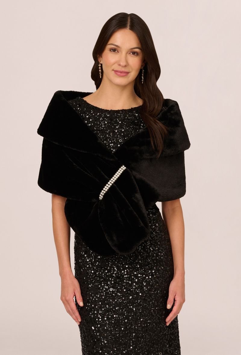Deze luxe zwarte faux fur stola straalt elegantie uit en is de perfecte aanvulling op een chique avondoutfit. Het zachte imitatiebont hangt sierlijk over de schouders en biedt zowel warmte als stijl, waardoor het ideaal is voor formele gelegenheden of speciale evenementen.