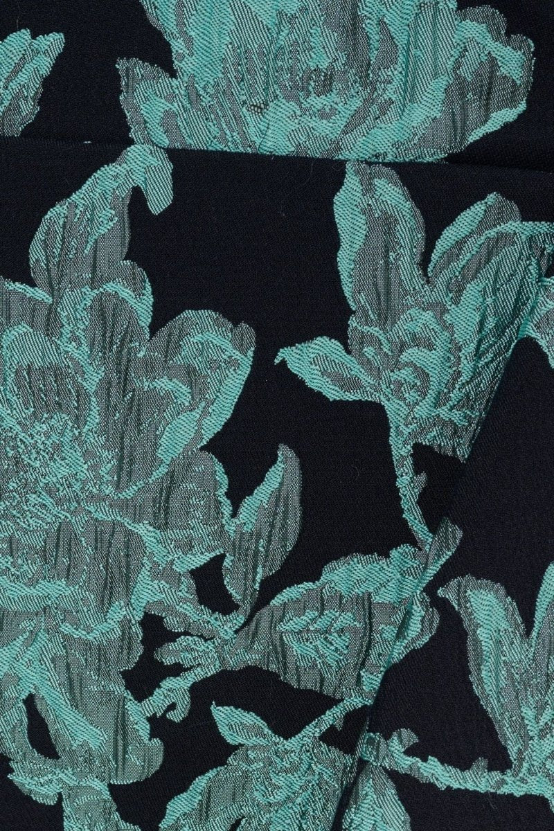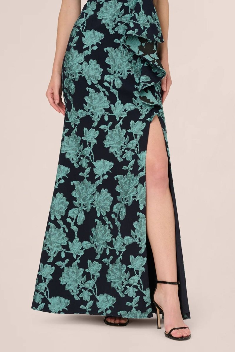 Deze adembenemende galajurk van Adrianna Papell is een waar statementstuk voor iedere speciale gelegenheid. De elegante shawl kraaglijn en de flatterende gewrapte taille creëren een prachtig vrouwelijk silhouet. De luxe jacquardstof met een verfijnd bloemenpatroon in zacht jadegroen komt schitterend naar voren op de diepe navy achtergrond, wat de jurk een rijk en stijlvol karakter geeft.