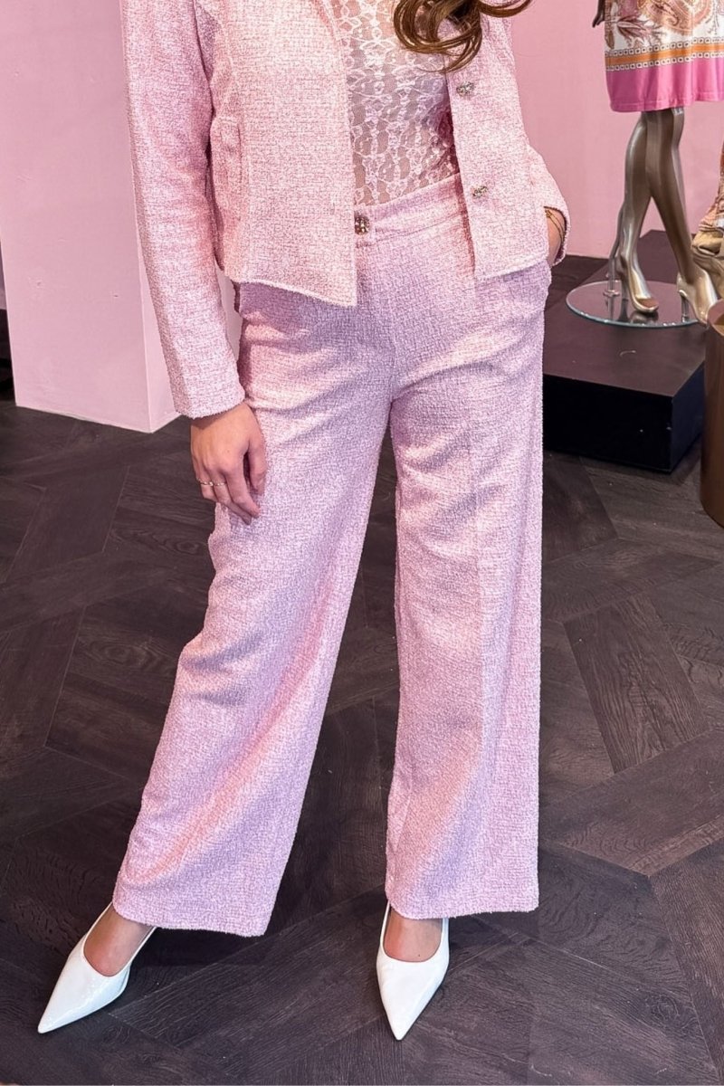 De pantalon heeft een nette tailleband met sluiting aan de voorzijde en is ontworpen om zowel comfortabel als chic te dragen. De bouclé structuur geeft de broek een exclusieve uitstraling, waardoor hij ideaal is voor feestelijke gelegenheden, zakelijke momenten of een stijlvolle daglook.