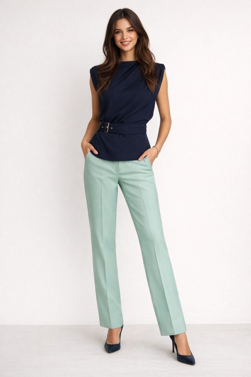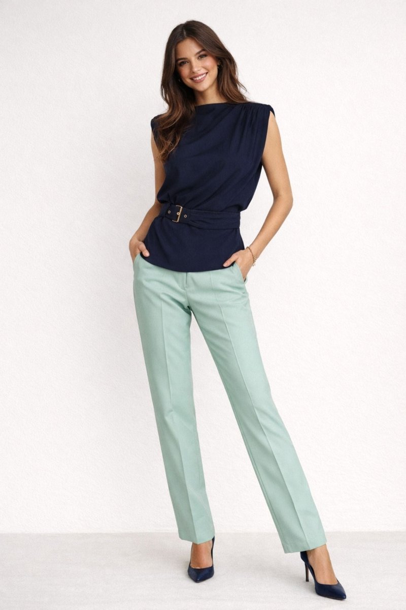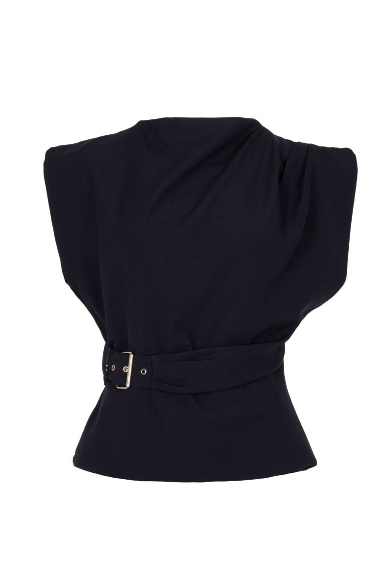 Deze elegante navy top combineert een moderne uitstraling met een vrouwelijke pasvorm. De top heeft een subtiel gedrapeerde halslijn en licht geplooide schouders, waardoor een verfijnd silhouet ontstaat. Het geïntegreerde tailleceintuur met stijlvolle gesp accentueert de taille en zorgt voor een mooi gevormd silhouet. De soepele stof valt comfortabel en maakt deze top zowel chic als draagbaar.