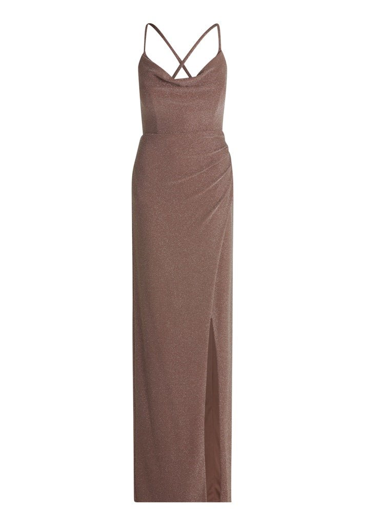 Geef elk bijzonder moment een vleugje glamour met deze verfijnde, glinsterende avondjurk. De subtiele rosé-taupe tint en de sprankelende stof zorgen voor een luxueuze uitstraling die moeiteloos in het oog springt zonder overheersend te zijn.