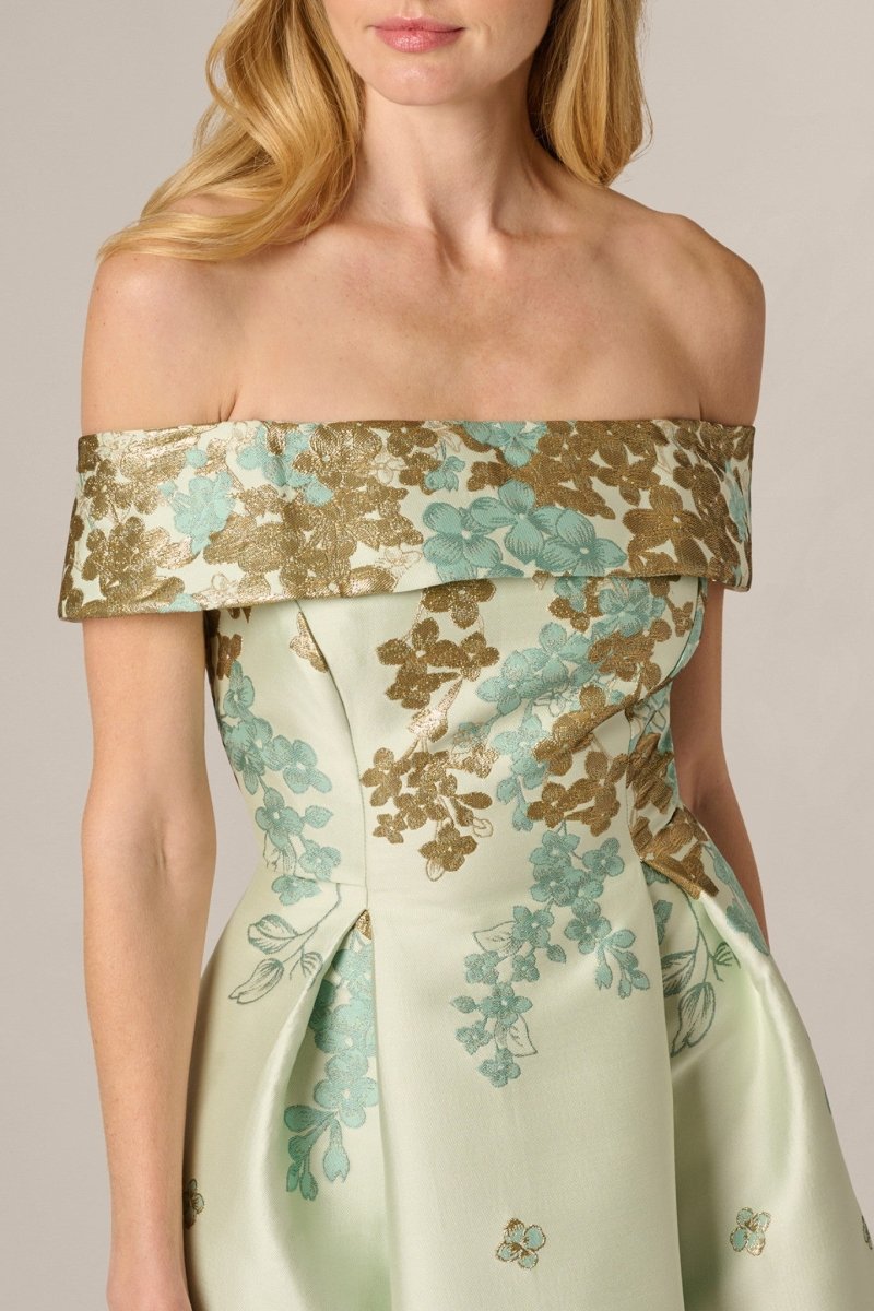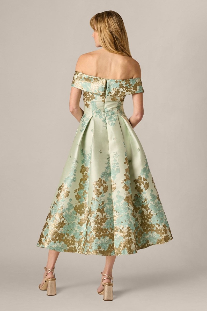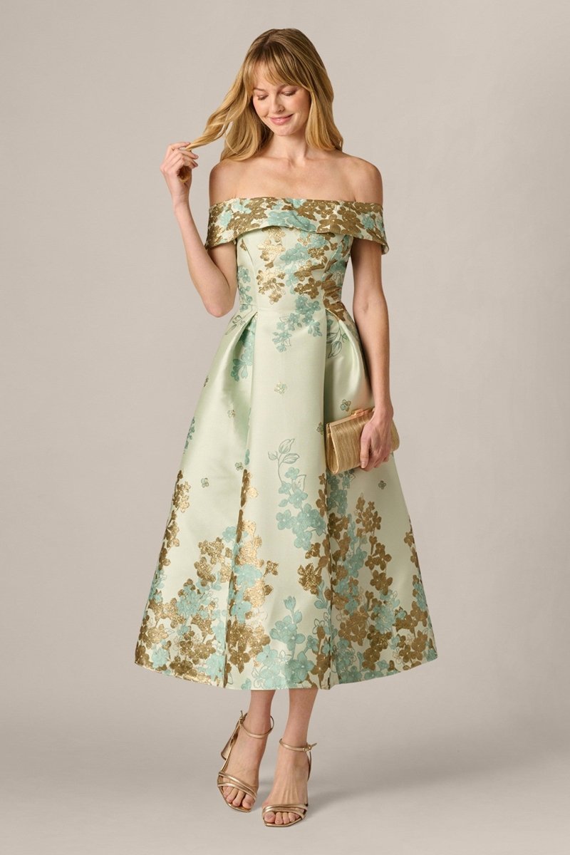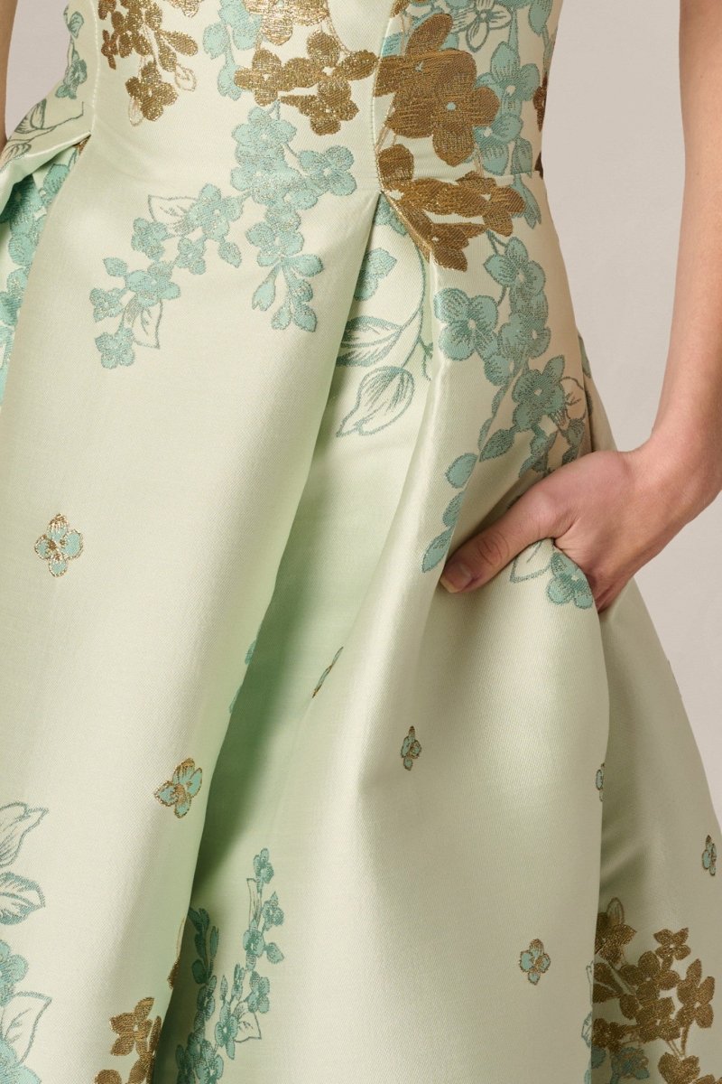 Deze stijlvolle jurk is de perfecte balans tussen klassieke elegantie en moderne verfijning. De zachte mintgroene basis in combinatie met het luxe bloemenpatroon in goud- en groentinten zorgt voor een exclusieve en rijke uitstraling – ideaal voor bijzondere gelegenheden.