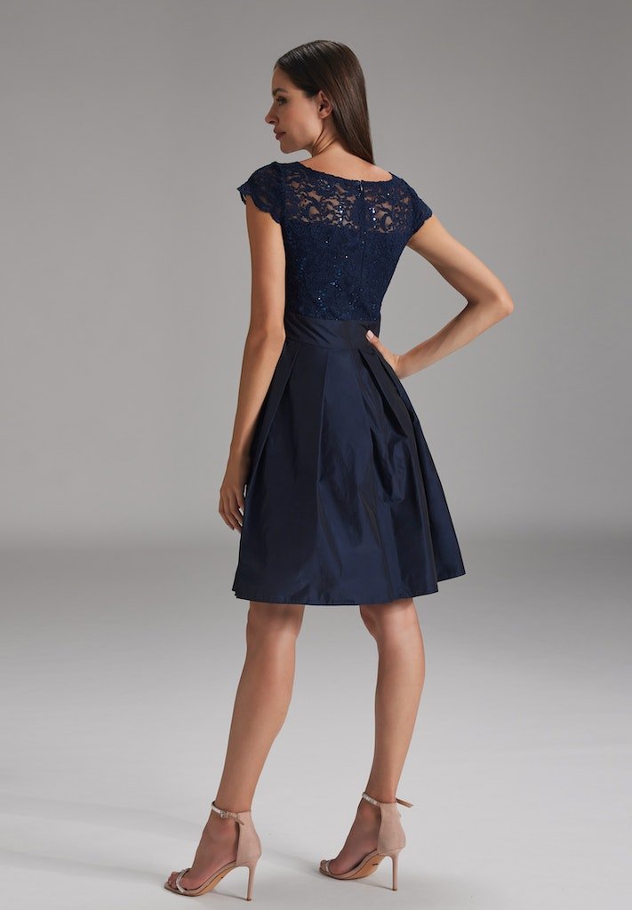 Fall in love with our elegant dress featuring a lace top, embellished with sparkling sequins. The round neckline and sleeveless cut add a touch of sophistication, while the taffeta skirt section ensures effortless flow and comfort. With a knee length and a subtle waistband, this dress is perfect for any occasion, combining style and class for an unforgettable look.
