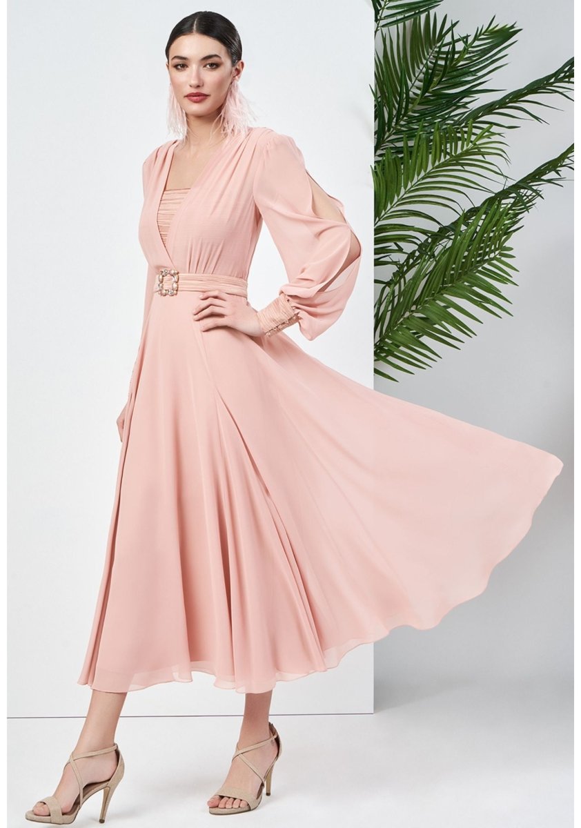 Step into a world of refined grace with Sonia Peña’s luxurious creation for the mother of the bride or groom. This powder-coloured midi dress, with a v-neck and a top in beautiful pleats, exudes pure elegance. The flowing chiffon skirt adds an airy charm, while the fitted waist with waist belt and embellished buckle with stones adds a flattering touch. The three-quarter sleeves with pleated ends and sheer buttons add subtle detail to this timeless creation.