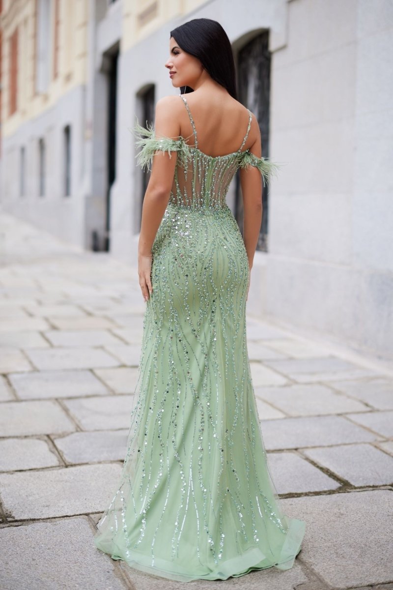 De nauwsluitende pasvorm accentueert sierlijk de lichaamsvorm, terwijl de semi-transparante tule subtiel zorgt voor een sensuele look. De bovenkant is rijkelijk versierd met handgeplaatste pailletten en kralen, die het licht op een betoverende manier weerkaatsen. De off-shoulder Carmenmouwen met zachte verenaccenten voegen een vleugje speelse luxe toe.