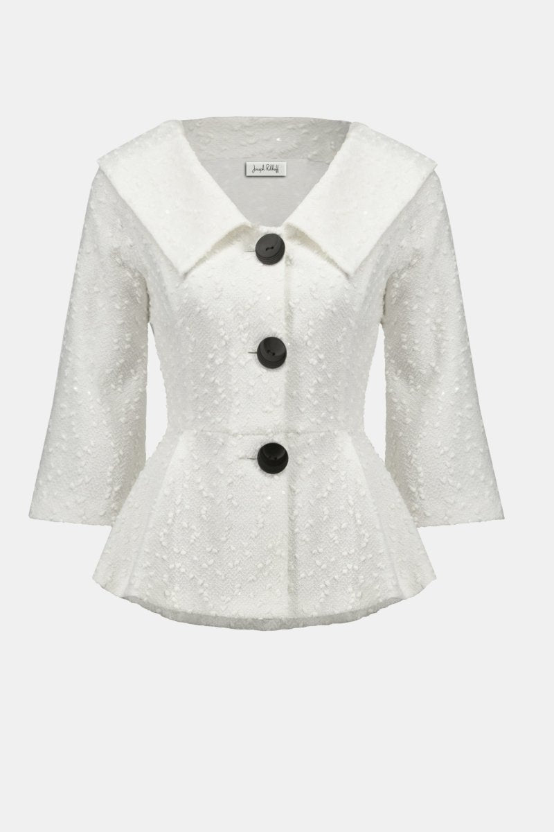 Deze stijlvolle off-white bouclé blazer is een tijdloos statement piece dat elegantie en verfijning uitstraalt. Het unieke reliëfpatroon in de stof en de opvallende grote zwarte knopen geven deze blazer een moderne en chique uitstraling. Dankzij de licht uitlopende onderzijde en driekwartmouwen heeft het jasje een vrouwelijke en speelse pasvorm.