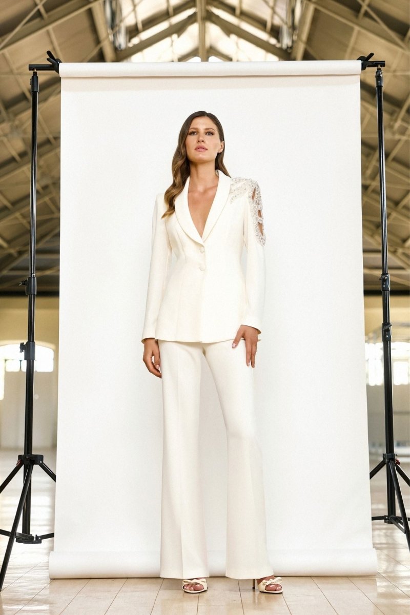 De zachte ivory tint maakt dit pak bijzonder geschikt voor een moderne bruid, een burgerlijk huwelijk, een tweede trouwlook of een stijlvolle bruiloftsgast die op zoek is naar iets anders dan een klassieke jurk. Tegelijkertijd is dit couture pak ook perfect voor gala’s, exclusieve evenementen of een luxueuze avondgelegenheid.