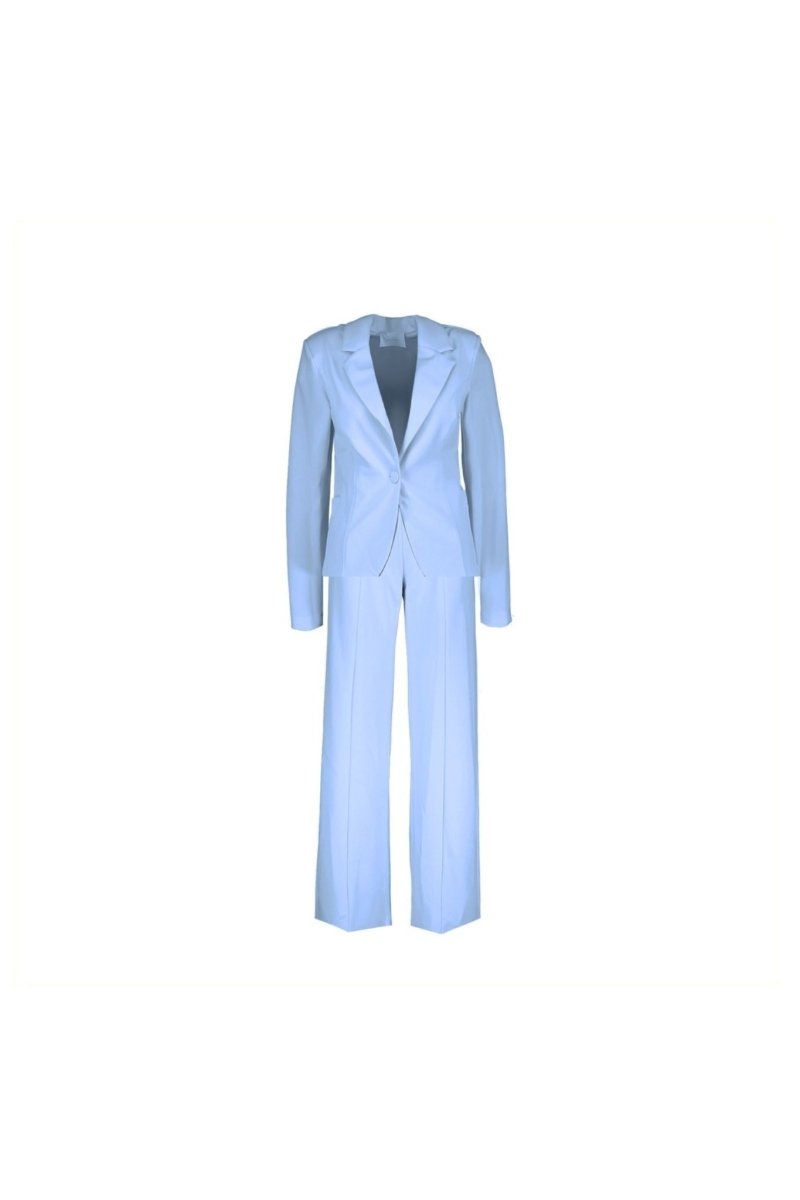 De blazer heeft een klassiek reverskraagje, een elegante sluiting aan de voorzijde en een licht getailleerde pasvorm die het silhouet mooi accentueert. De pantalon heeft een rechte, wijde pijp die zorgt voor een elegante en flatterende uitstraling. Dankzij de comfortabele en soepel vallende stof draagt de set bijzonder prettig gedurende de hele dag.