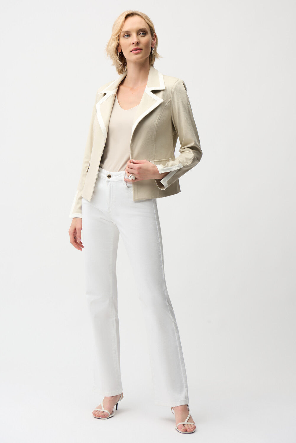 Deze elegante blazer van Joseph Ribkoff is een verfijnd en tijdloos item dat moeiteloos luxe en draagcomfort combineert. De blazer is uitgevoerd in een zachte crème-/ecrutint en heeft een klassieke reverskraag met een contrasterende afwerking, wat zorgt voor een frisse en moderne uitstraling.