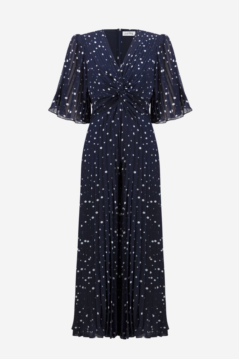Deze elegante jumpsuit combineert een speels stippenmotief met een verfijnde, vloeiende pasvorm. De stof is licht en plissé gevouwen, wat zorgt voor een luchtig, sierlijk effect bij elke beweging. De V-hals en gedraaide knoopdetail in het midden creëren een flatterend silhouet dat de taille subtiel accentueert.