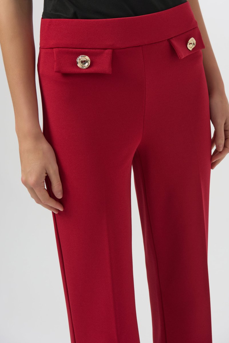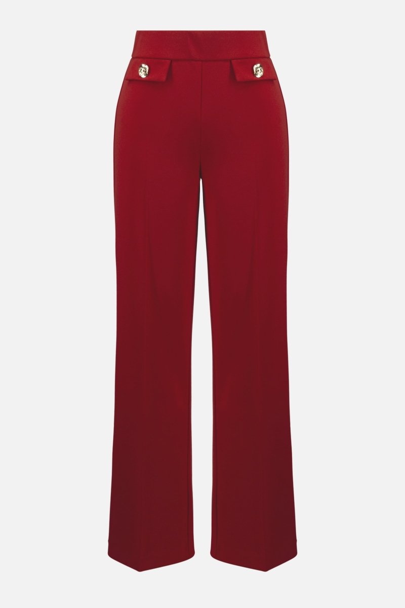 Deze elegante rode broek is een echte blikvanger die kracht en stijl uitstraalt. Het ontwerp heeft een rechte, slank vallende pijp die de benen langer laat lijken en zorgt voor een tijdloze, elegante uitstraling. De hoge taille is voorzien van decoratieve flappen met gouden knopen, wat de broek een luxe en verfijnd karakter geeft.
