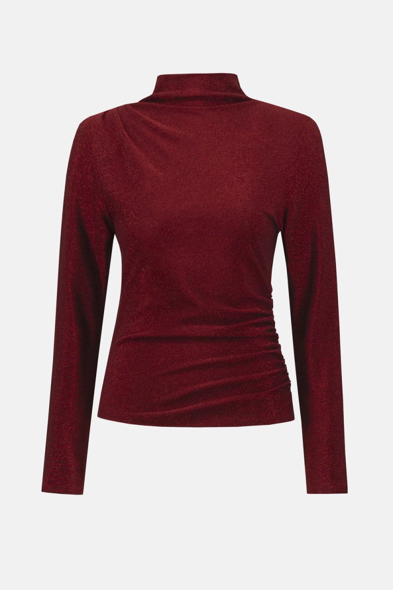 Deze elegante bordeauxrode glittertop is een perfecte mix van stijl en comfort. De top heeft een opvallende subtiele glans, waardoor hij ideaal is voor feestelijke gelegenheden of een chique avondje uit. Met de lange mouwen en de lichte colkraag straalt hij een tijdloze elegantie uit, terwijl de geplooide details aan de zijkant zorgen voor een flatterende pasvorm die mooi aansluit op het lichaam.