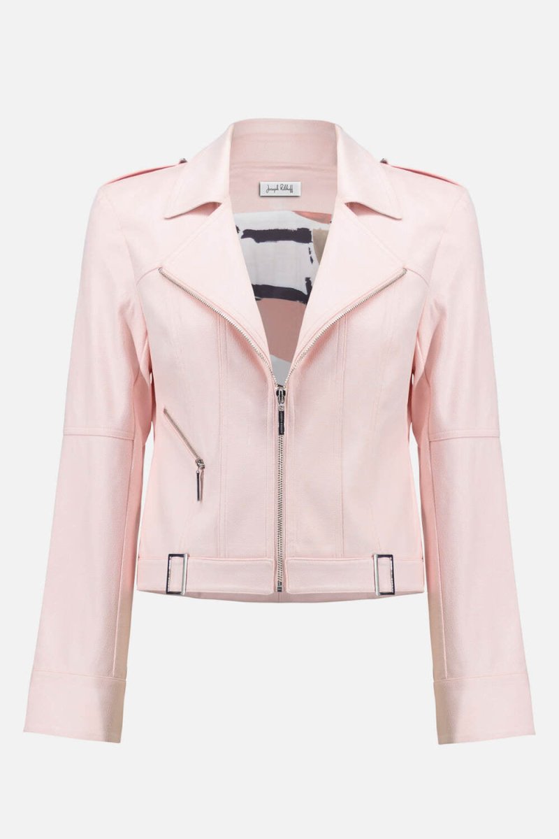 Maak kennis met dit stijlvolle, zachtroze biker-inspired jasje van Joseph Ribkoff – een perfecte combinatie van elegantie, comfort en moderne flair. Het jasje is uitgevoerd in een hoogwaardige foiled faux suede, wat zorgt voor een subtiele shimmer en een luxueuze uitstraling. De stof voelt zacht en soepel aan, waardoor het jasje heerlijk draagt en mooi in vorm blijft.