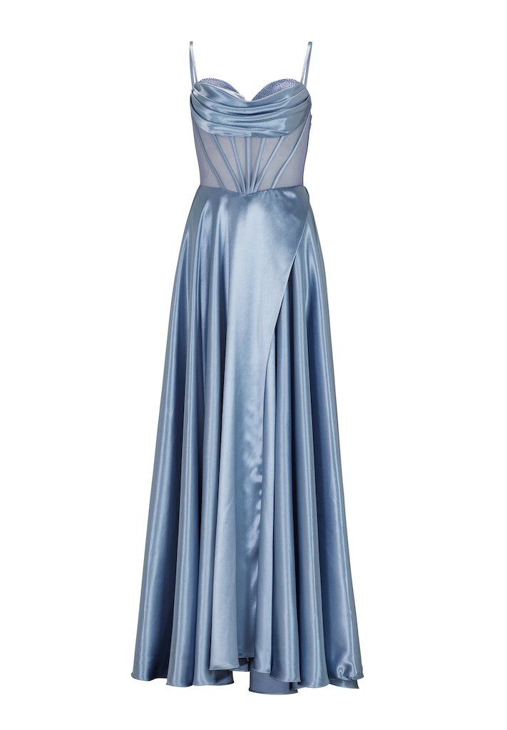 Deze prachtige satijnen gala jurk heeft een fantastisch bovenstuk voorzien van steentjes en drappering. De jurk heeft een split en spaghettibandjes.
