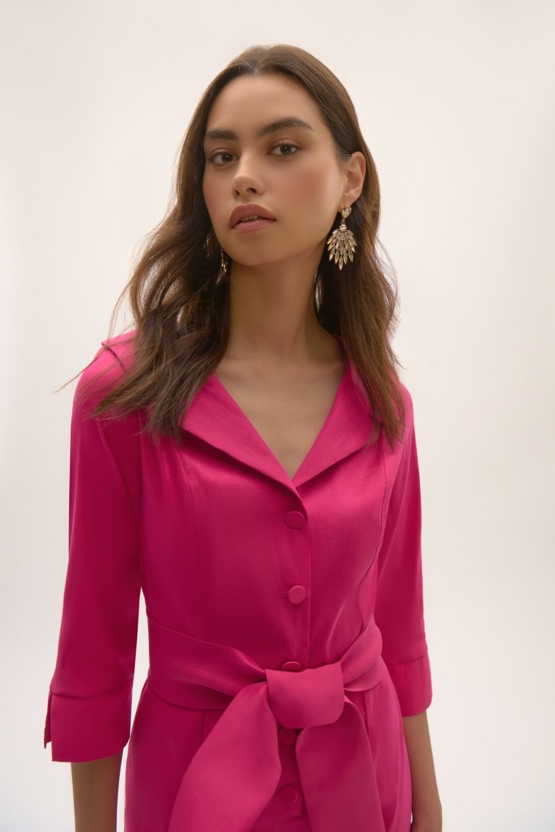 De bedekte knoopsluiting aan de voorkant maakt de jurk moeiteloos draagbaar, en de flatterende aangesloten pasvorm accentueert je silhouet op subtiele wijze. Een perfecte mix van stijl en gratie, ideaal voor elke gelegenheid waar je elegant én zelfverzekerd voor de dag wilt komen.
