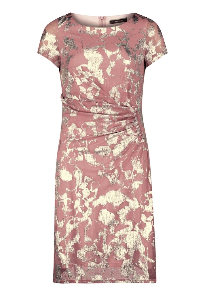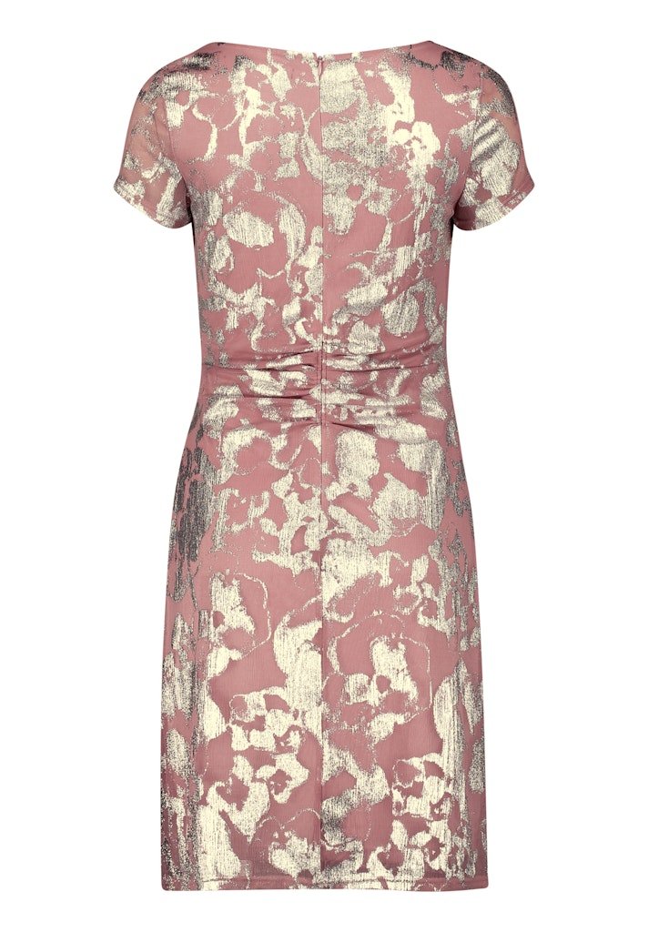 Deze sierlijke jurk met korte mouwen en ronde hals is een verfijnde keuze voor feestelijke gelegenheden. Het knielange model combineert een klassieke pasvorm met een opvallend florale print, uitgevoerd in een glanzende afwerking die het licht prachtig vangt. Dankzij de ritssluiting aan de achterzijde sluit de jurk mooi aan en blijft het silhouet elegant en comfortabel.