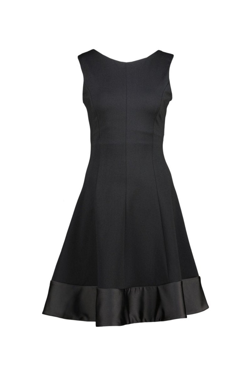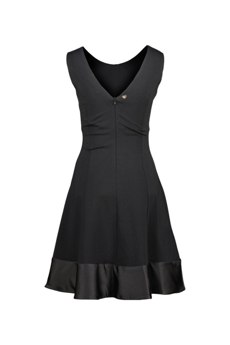 De aangesloten bovenkant loopt vloeiend uit in een zwierige rok die elegant meebeweegt. Onderaan de rok zorgt een chique, glanzende satijnlook rand voor een luxueuze touch. De zachte V-hals aan de achterkant – afgewerkt met een subtiel hartdetail bij de rits – geeft de jurk een extra vrouwelijke en moderne uitstraling.