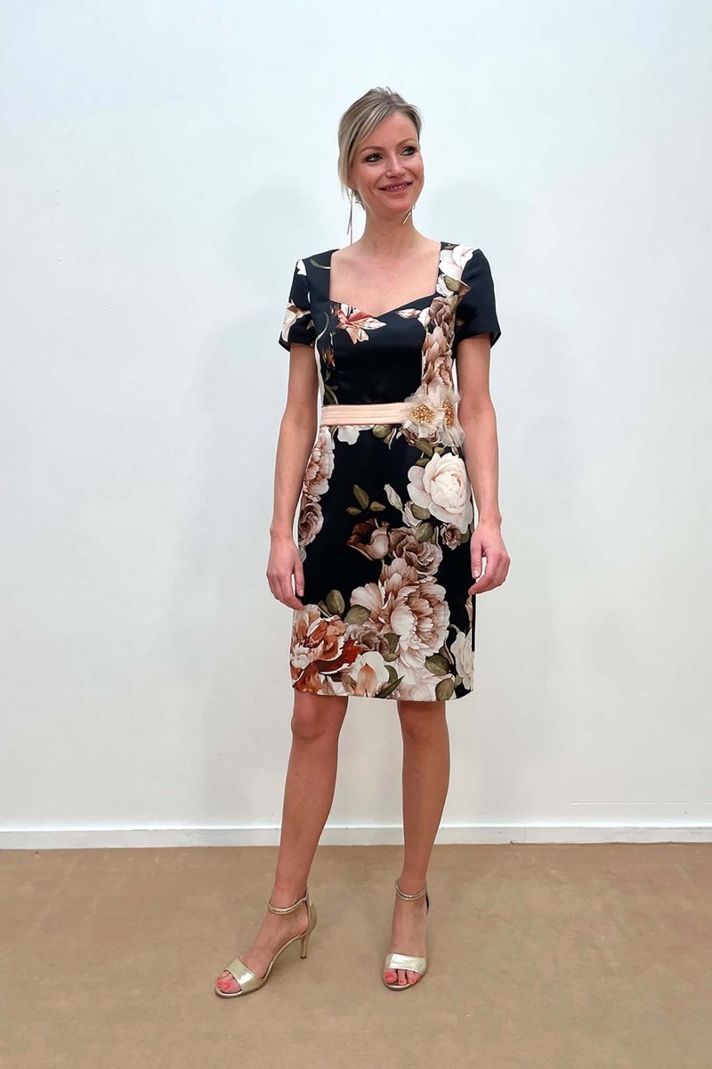 Deze schitterende Linea Raffaelli set combineert elegantie met een vleugje drama. De jurk is uitgevoerd in een luxe zwarte basis met een rijke bloemenprint in zachte peach-, crème- en bruintinten. De vierkante halslijn en de korte mouw zorgen voor een vrouwelijke en flatterende pasvorm, terwijl de tailleriem met bloemapplicatie een stijlvol detail toevoegt.