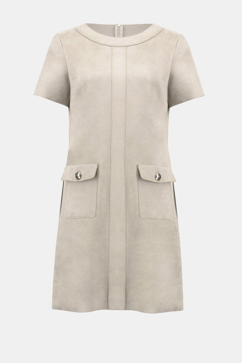 Twee opgestikte zakken met decoratieve knopen aan de voorkant geven de jurk een speelse, doch verfijnde touch. De korte mouwen en ronde hals maken dit item perfect voor zowel zakelijke als informele gelegenheden. Combineer met hoge laarzen of hakken voor een moderne, verfijnde look.