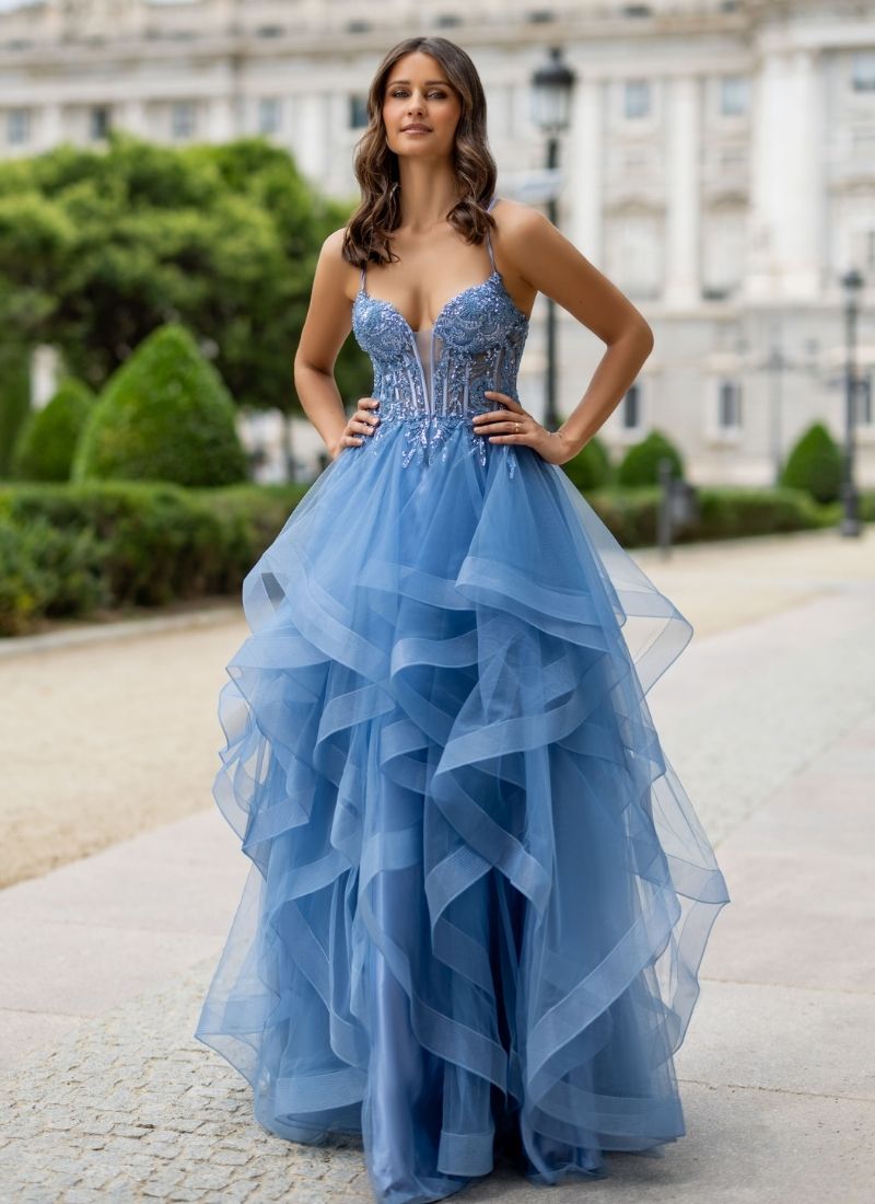Deze spectaculaire tule galajurk met gelaagde rok is een echte blikvanger voor iedere bijzondere gelegenheid. Het verfijnde, gecorseerde lijfje is rijk gedecoreerd met luxe borduursels en subtiele pailletten, wat zorgt voor een elegante en vrouwelijke uitstraling. De diepe V-hals met transparant inzetstuk accentueert het decolleté op stijlvolle wijze, terwijl de smalle schouderbandjes het geheel een verfijnde look geven.