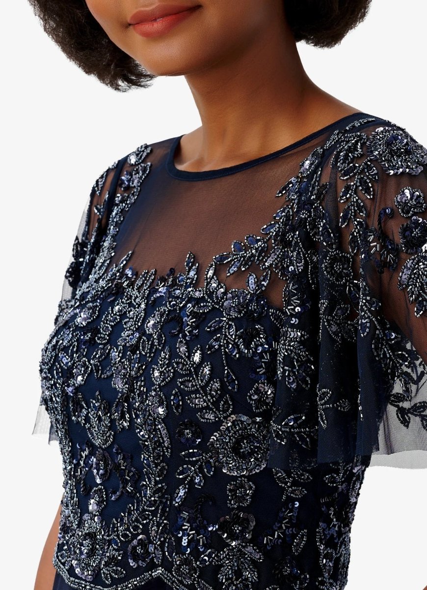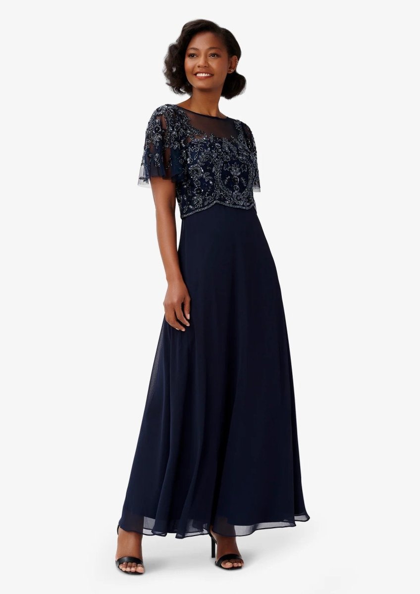 Pure elegantie zul je uitstralen in onze maxi jurk met oogverblindend handgenaaid kralenwerk in een mooi bloemenpatroon. De lange rok is gemaakt van een zacht geweven chiffon en is afgewerkt met zachte plooien voor een extra soepele val. Blinde ritssluiting aan de achterkant. Een perfecte keuze voor bijvoorbeeld een black-tie gala.