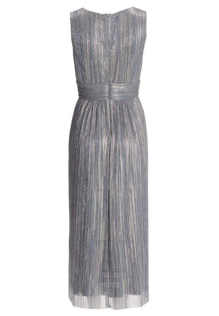 Deze elegante plissé jurken zijn een perfecte keuze voor een bruiloft, gala of andere feestelijke gelegenheid. Het verfijnde ontwerp combineert een vrouwelijke V-hals met een prachtig geplooid silhouet en een subtiele metallic glans die zorgt voor een luxe uitstraling, zonder te overheersen.