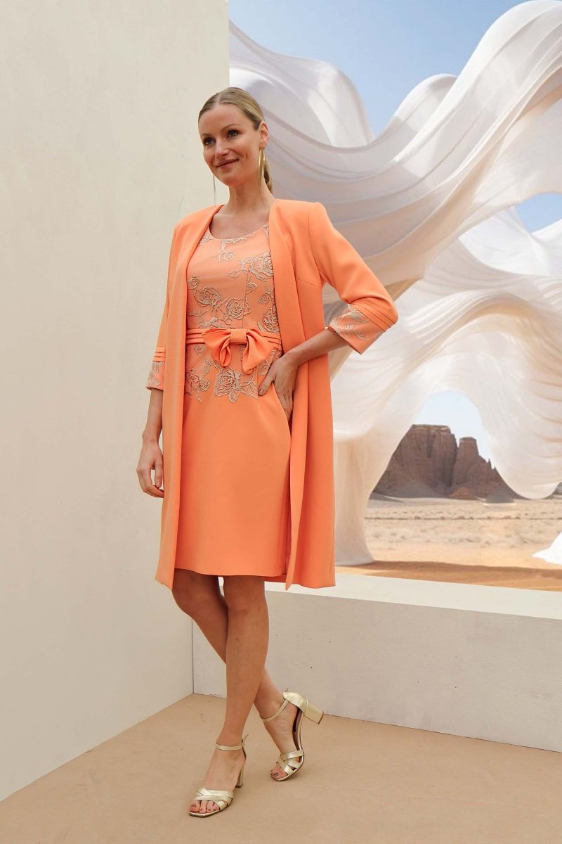 Deze elegante 2-delige set van Linea Raffaelli bestaat uit een stijlvolle jurk en een bijpassende mantel in een frisse papaya crêpe stof.