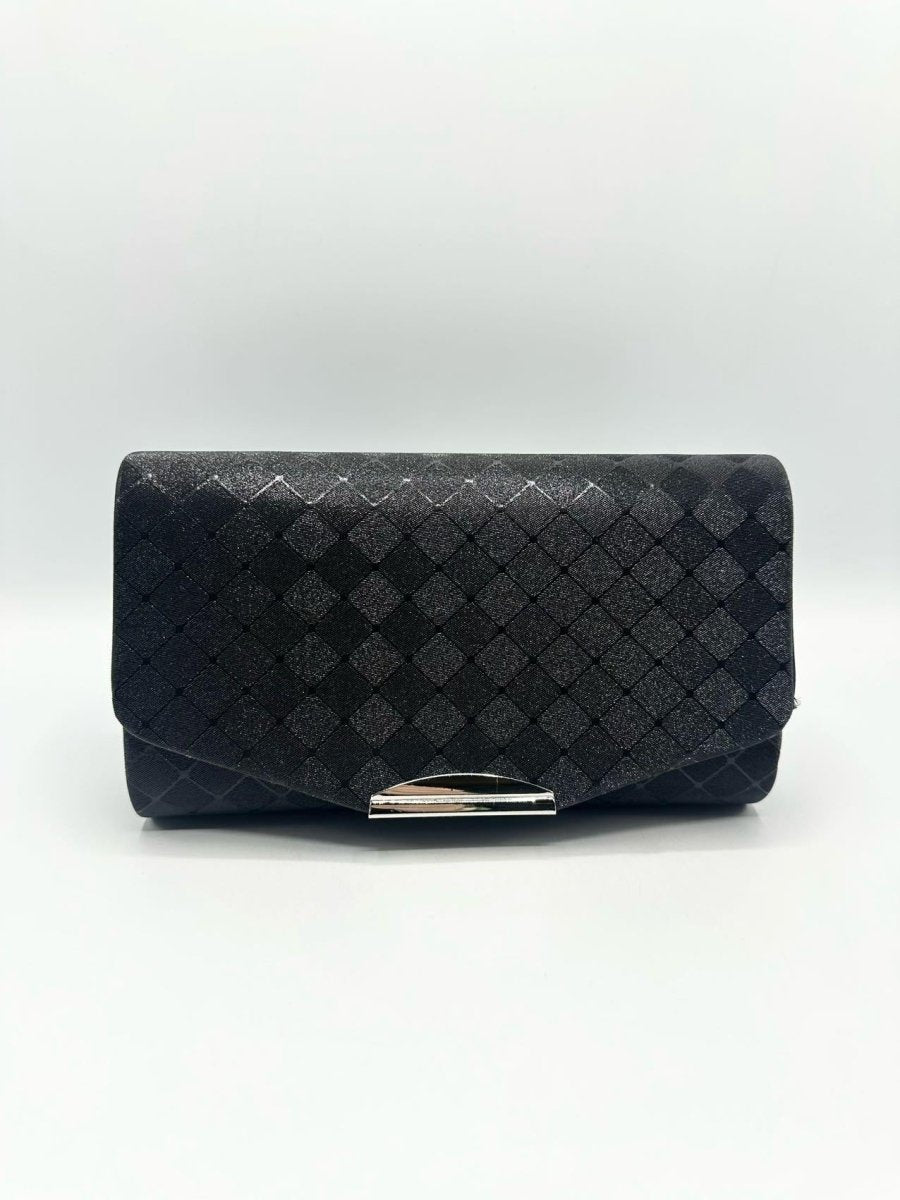 Deze tijdloze clutch combineert eenvoud en glamour in één ontwerp. De glitterstof met subtiel ruitdessin zorgt voor een stijlvolle, luxueuze uitstraling, terwijl het metalen detail op de flap een moderne touch toevoegt. Dankzij de afmeting van 22 x 5 x 12 cm biedt de tas genoeg ruimte voor je essentials, zoals telefoon, make-up en sleutels.