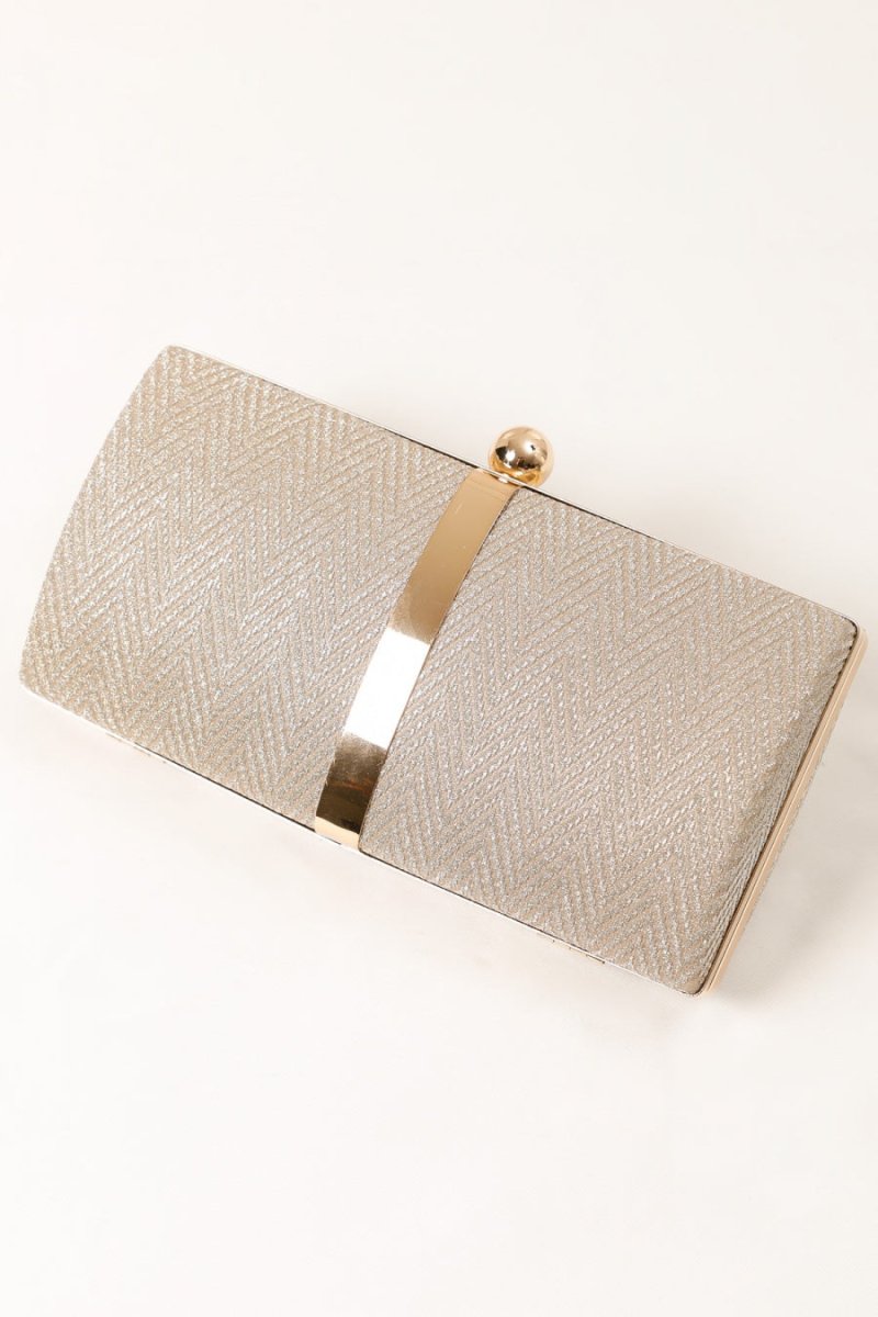 Deze clutch combineert elegantie met een moderne uitstraling. Het subtiele visgraatpatroon in glanzende stof geeft de tas een verfijnde textuur, terwijl de metalen middenband met bolsluiting een luxe detail toevoegt.