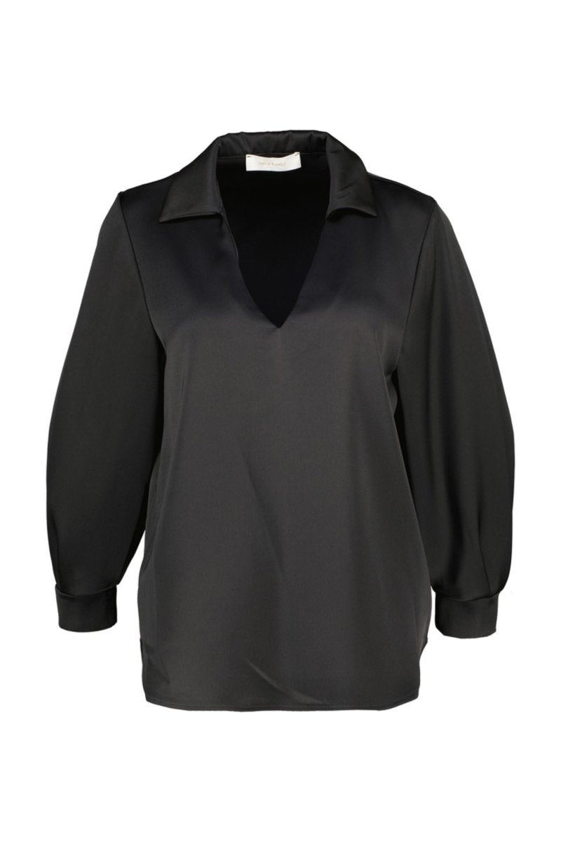 De New Alma blouse van Amélie & Amélie straalt tijdloze klasse en vrouwelijke elegantie uit. Deze satijnen blouse heeft een lichte glans die zorgt voor een luxueuze uitstraling. De diepe V-hals met kraag en lange mouwen met manchetten geven het ontwerp een moderne en verfijnde look.