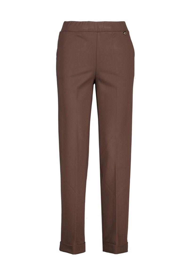 De rechte pijp met een subtiele omslag aan de zoom zorgt voor een tijdloos en verzorgd silhouet. De broek is voorzien van een hoge taille met een elastische band aan de achterzijde, waardoor hij mooi aansluit zonder in te snijden. Een klein metalen logo-detail voegt een verfijnde finishing touch toe.