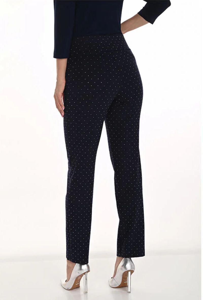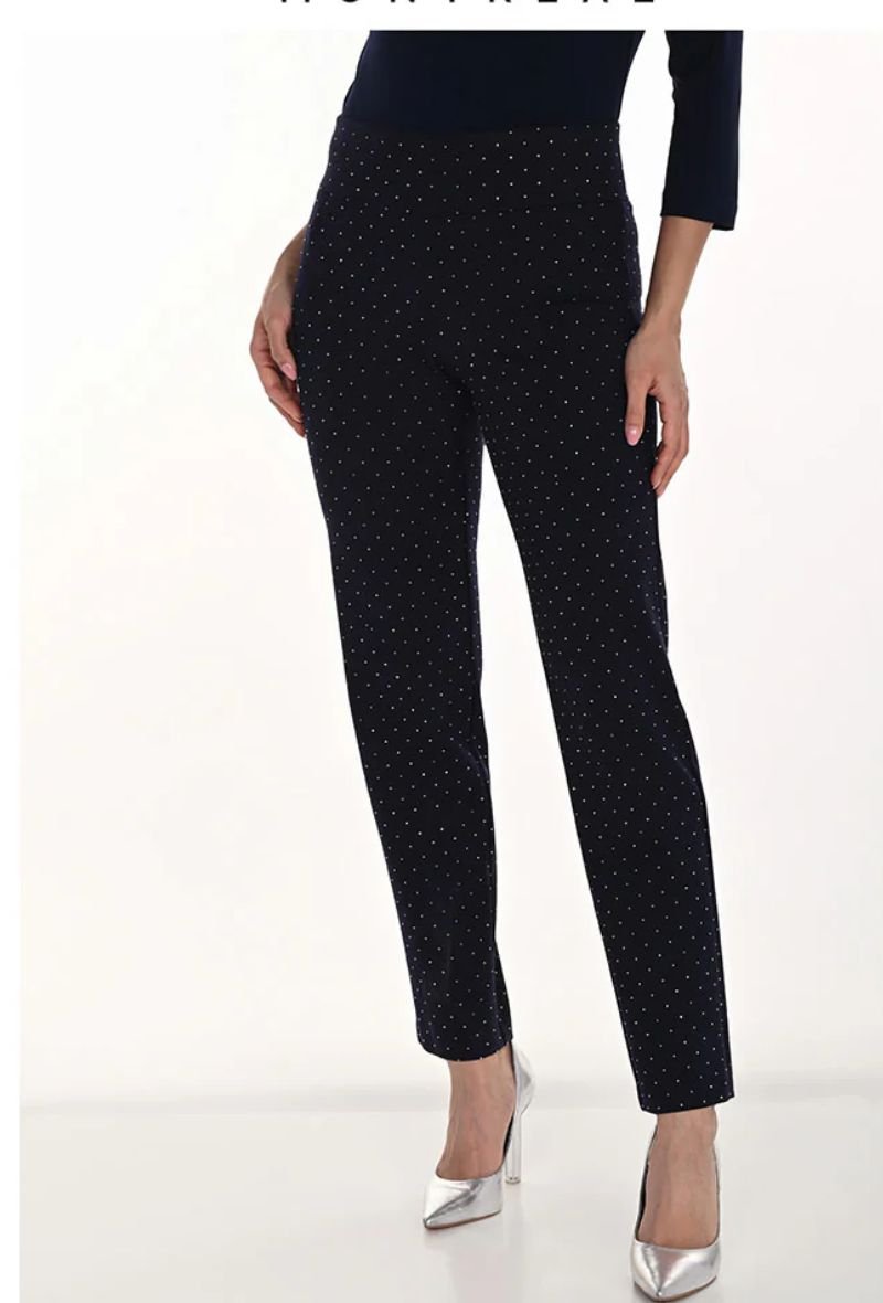 Deze elegante pantalon van Frank Lyman is een echte eyecatcher. De diepe navy kleur wordt verfraaid met schitterende strass steentjes, waardoor de broek een luxe en feestelijke uitstraling krijgt. Dankzij de comfortabele stretchstof en de flatterende pasvorm sluit de pantalon mooi aan en biedt hij tegelijk optimaal draagcomfort.