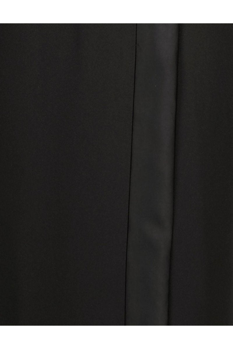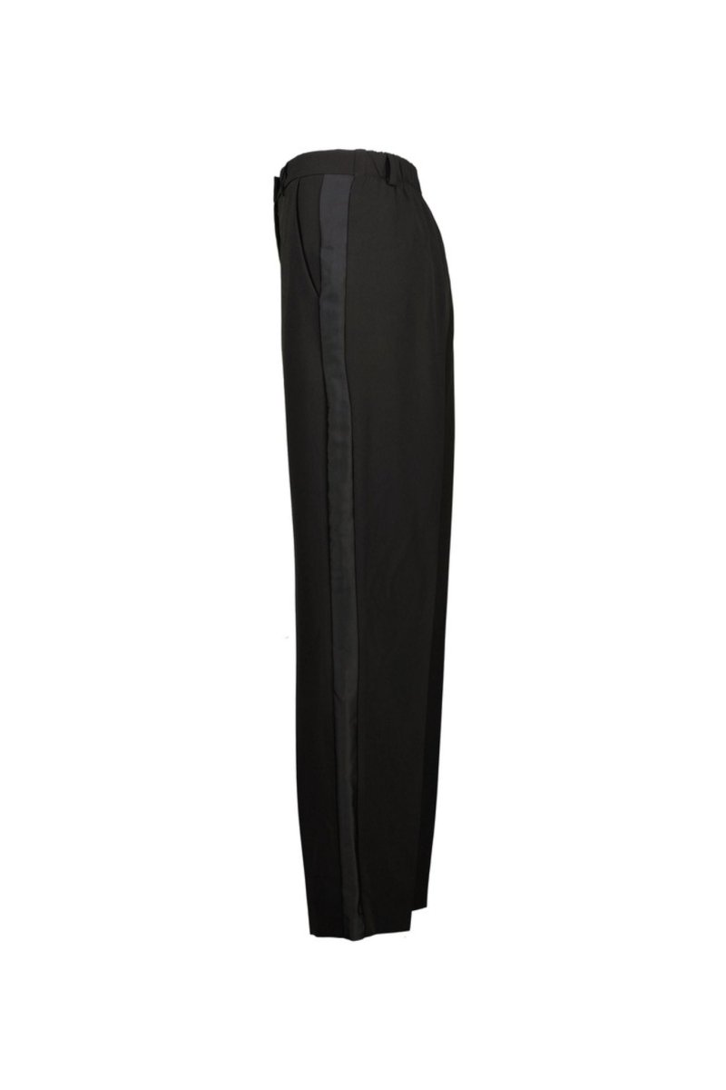 De pantalon heeft een rechte, licht uitlopende pasvorm die mooi langs het lichaam valt. Langs de zijkanten loopt een satijnen bies, die de klassieke tuxedo-stijl een moderne, vrouwelijke twist geeft. Het ontwerp is afgewerkt met een nette tailleband, riemlussen en een gladde sluiting voor een strakke, elegante uitstraling.