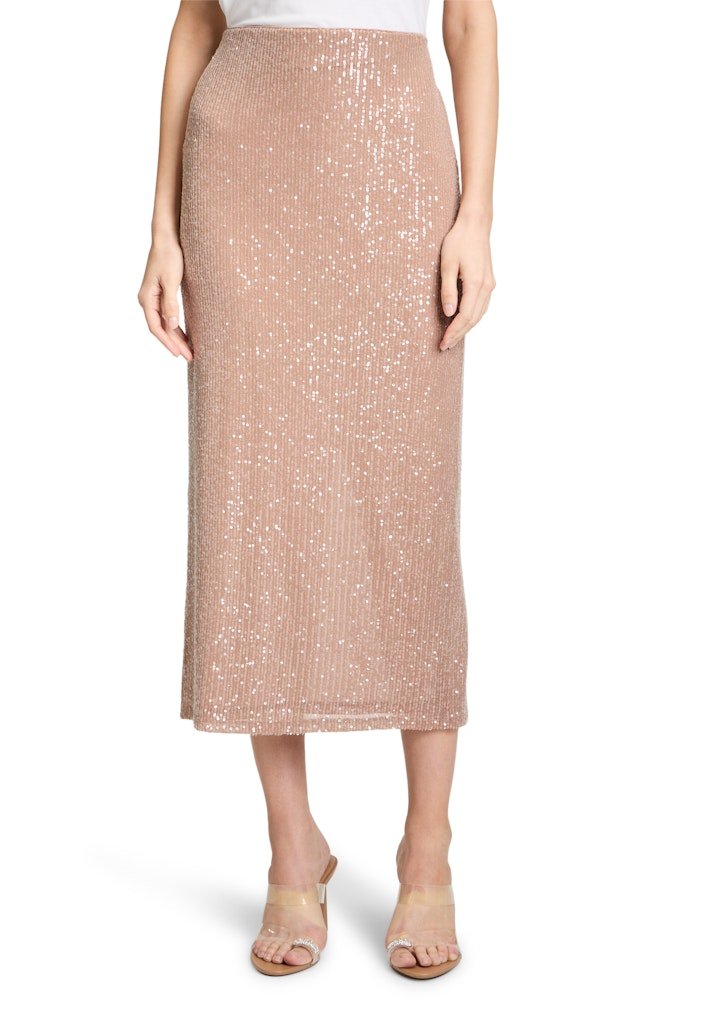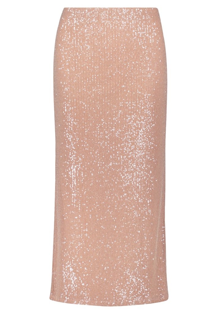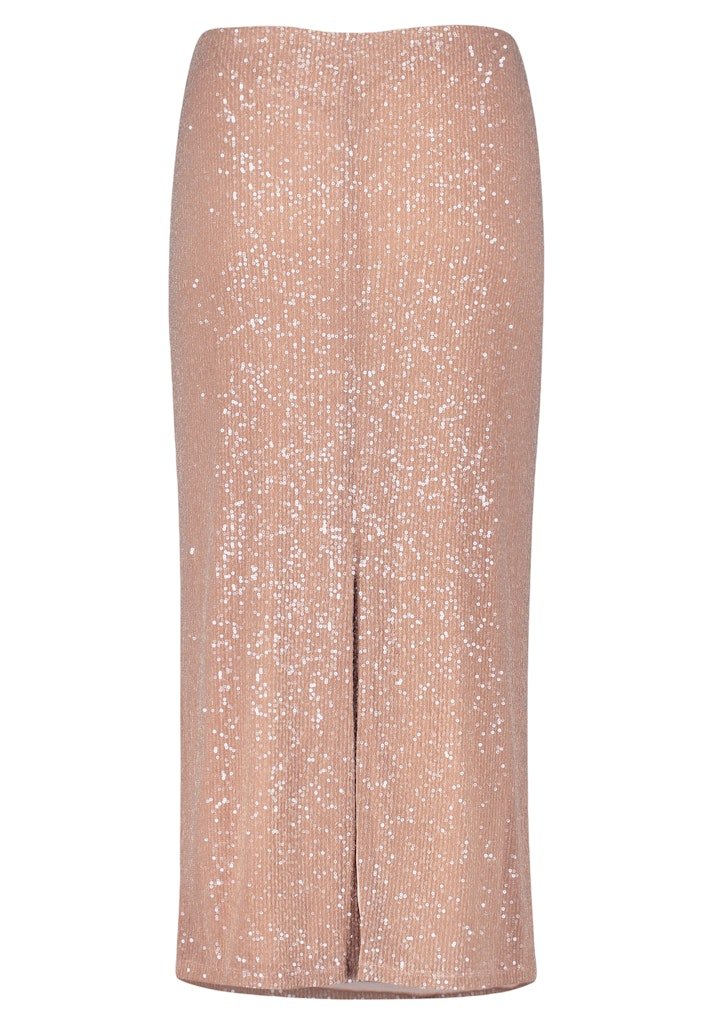 Deze prachtige midi-rok in de kleur macchiato is een echte eyecatcher dankzij de glinsterende pailletten die het hele ontwerp sieren. De accentuerende pasvorm benadrukt elegant de natuurlijke lijnen van het lichaam, terwijl de lengte van 88 cm vanaf de taille zorgt voor een verfijnde, vrouwelijke uitstraling. Het effen patroon maakt deze rok veelzijdig genoeg om zowel feestelijk als stijlvol casual te dragen.