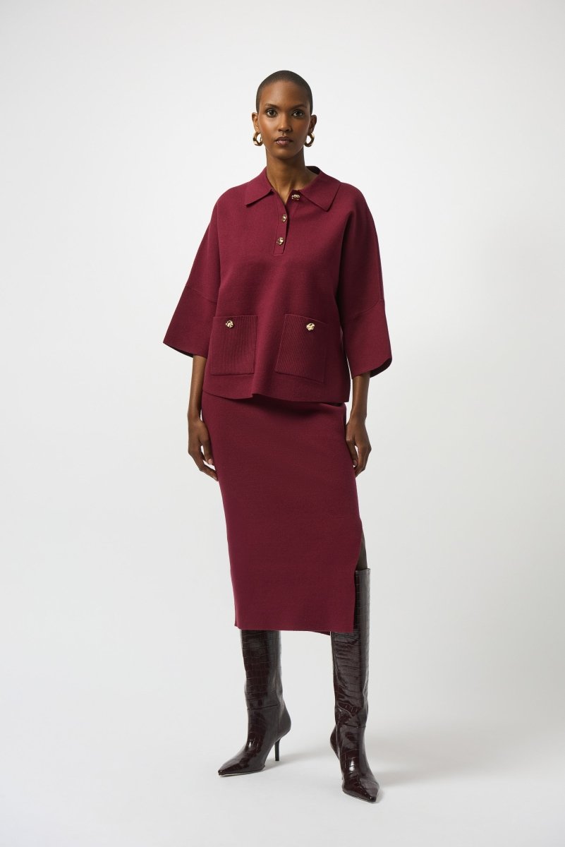 Deze elegante kokerrok in diepe bordeauxrode tint is een tijdloze aanvulling op je garderobe. Het minimalistische design straalt klasse uit en benadrukt de vrouwelijke vormen door de rechte, aangesloten pasvorm. De midi-lengte en de subtiele split aan de zijkant zorgen voor zowel bewegingsvrijheid als een verfijnde uitstraling.