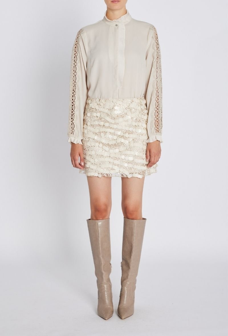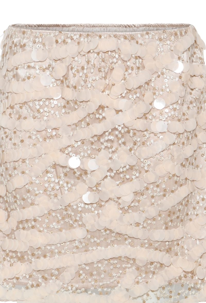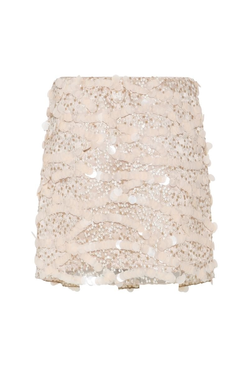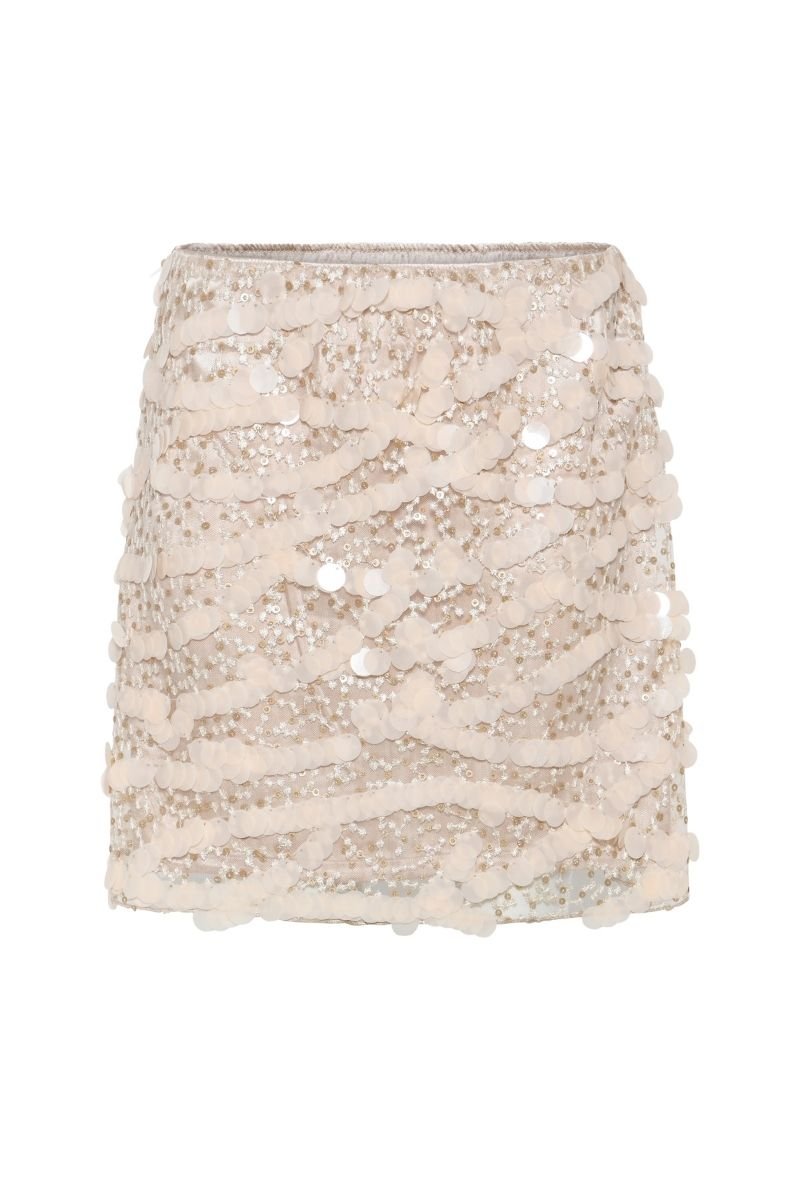De SweetpieBB Joannas Skirt van Bruuns Bazaar is dé ultieme feestelijke rok die elegantie en glamour perfect combineert. Deze mini-rok is rijkelijk versierd met pailletjes en kraaltjes in een speels patroon, waardoor hij een luxe uitstraling krijgt die meteen in het oog springt.