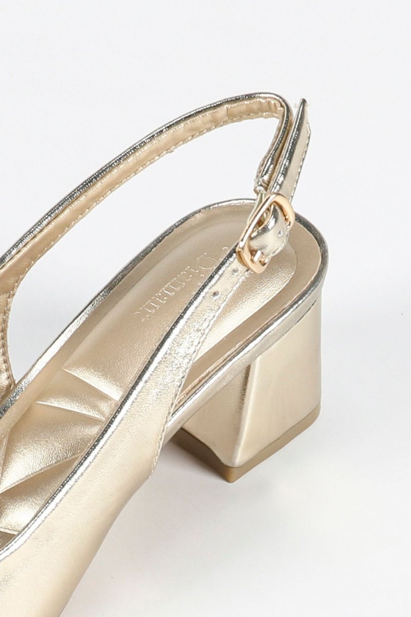De metallic gouden afwerking geeft de schoen een chique, tijdloze uitstraling die perfect is voor zowel feestelijke gelegenheden als een stijlvolle dagdagelijkse look. Dankzij de verstelbare slingback-band blijft de schoen perfect op zijn plaats, terwijl de zachte, gewatteerde binnenzool zorgt voor optimaal comfort gedurende de hele dag.