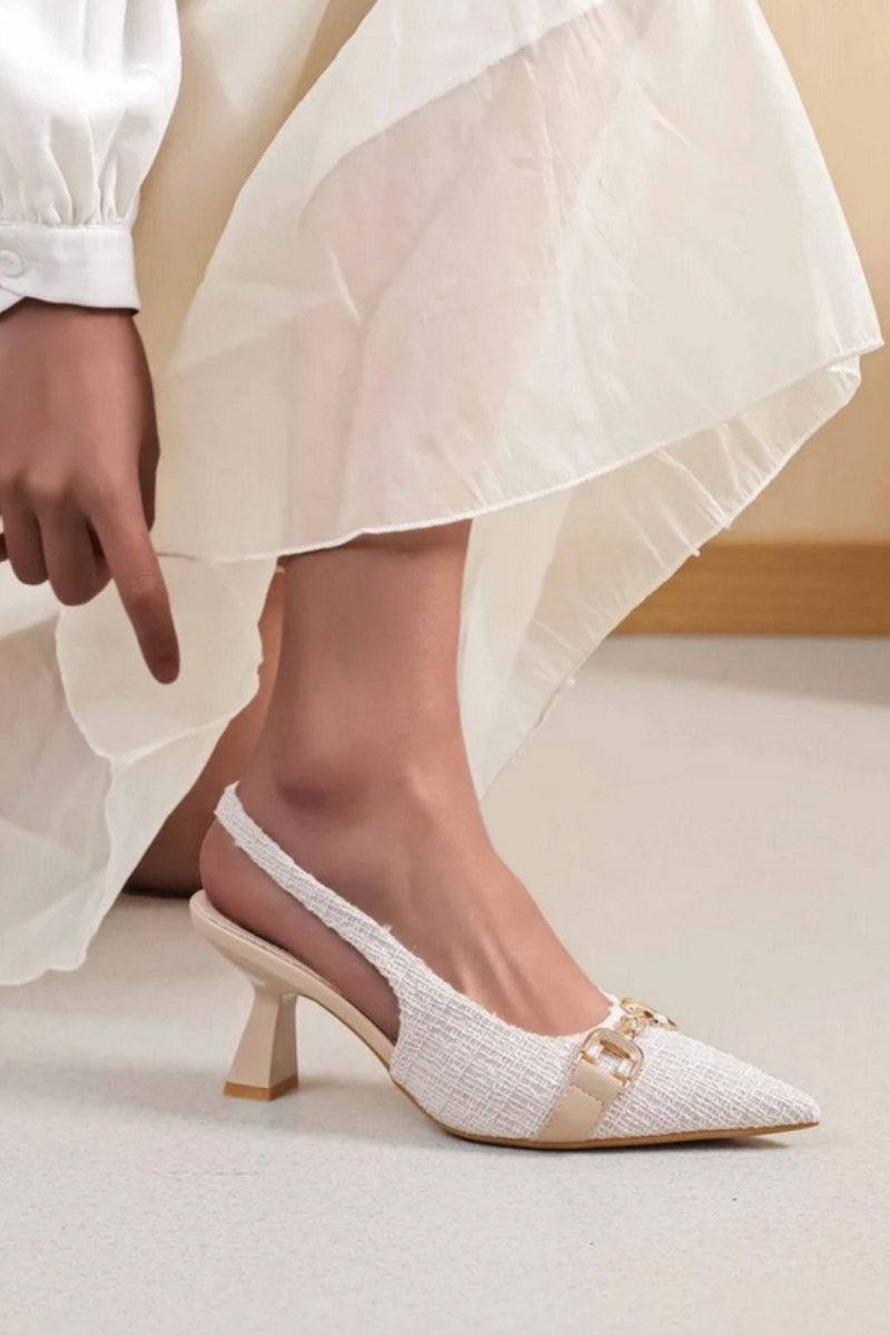 Deze stijlvolle slingback pumps in een verfijnde beige/taupe tint zijn de perfecte keuze voor een elegante en vrouwelijke look. Het subtiele geweven textuurmateriaal geeft de schoenen een luxe uitstraling, terwijl de spitse neus en de decoratieve gouden gesp aan de voorzijde zorgen voor een tijdloos en chic accent.