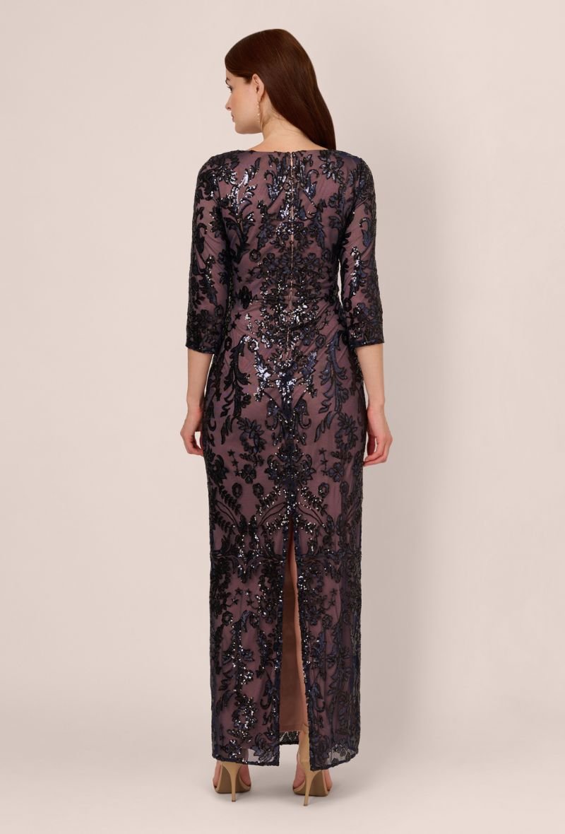 Maak een onvergetelijke indruk met deze schitterende avondjurk van Adrianna Papell. De jurk is rijkelijk versierd met handgemaakte pailletten en kralen in navy en roségoud, die een betoverend patroon vormen. De elegante V-halslijn en driekwartmouwen zorgen voor een vrouwelijke en verfijnde uitstraling.