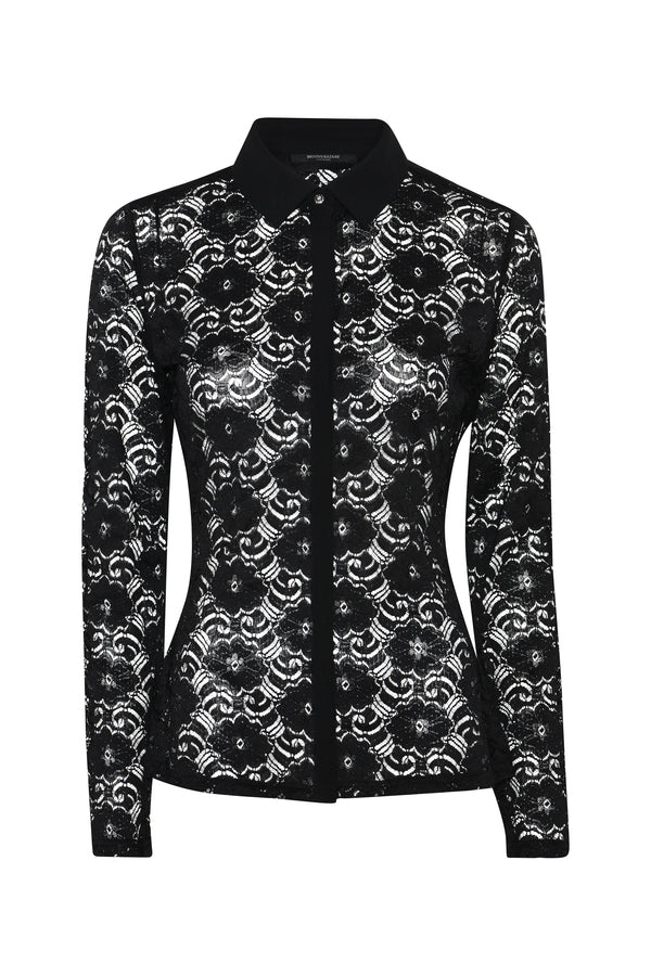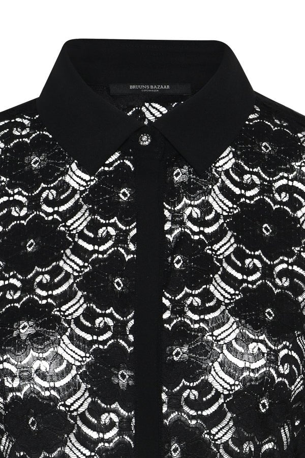 Voeg een vleugje elegantie en verfijning toe aan je garderobe met deze zwarte kanten blouse van Bruuns Bazaar. De blouse is volledig vervaardigd uit fijn kant met een sierlijk bloemenpatroon dat subtiel transparant is en een vrouwelijke, verfijnde uitstraling creëert. Het ontwerp heeft lange mouwen, een klassieke kraag en een verborgen knoopsluiting voor een moderne en strakke afwerking.