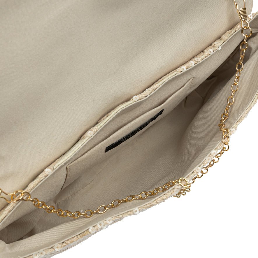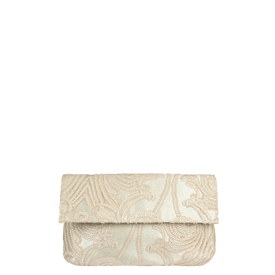 Deze rijk uitziende bone clutch, voldoet volledig aan de trends van dit seizoen. Deze tas kan ook over de schouder worden gedragen dankzij de meegeleverde extra schouderriem. Aan de binnenkant heeft deze tas een hoofdcompartiment met één binnenvakje. De metaal kleur is licht goud De afmetingen (breedte / hoogte / diepte) van deze clutch zijn 27x17x3