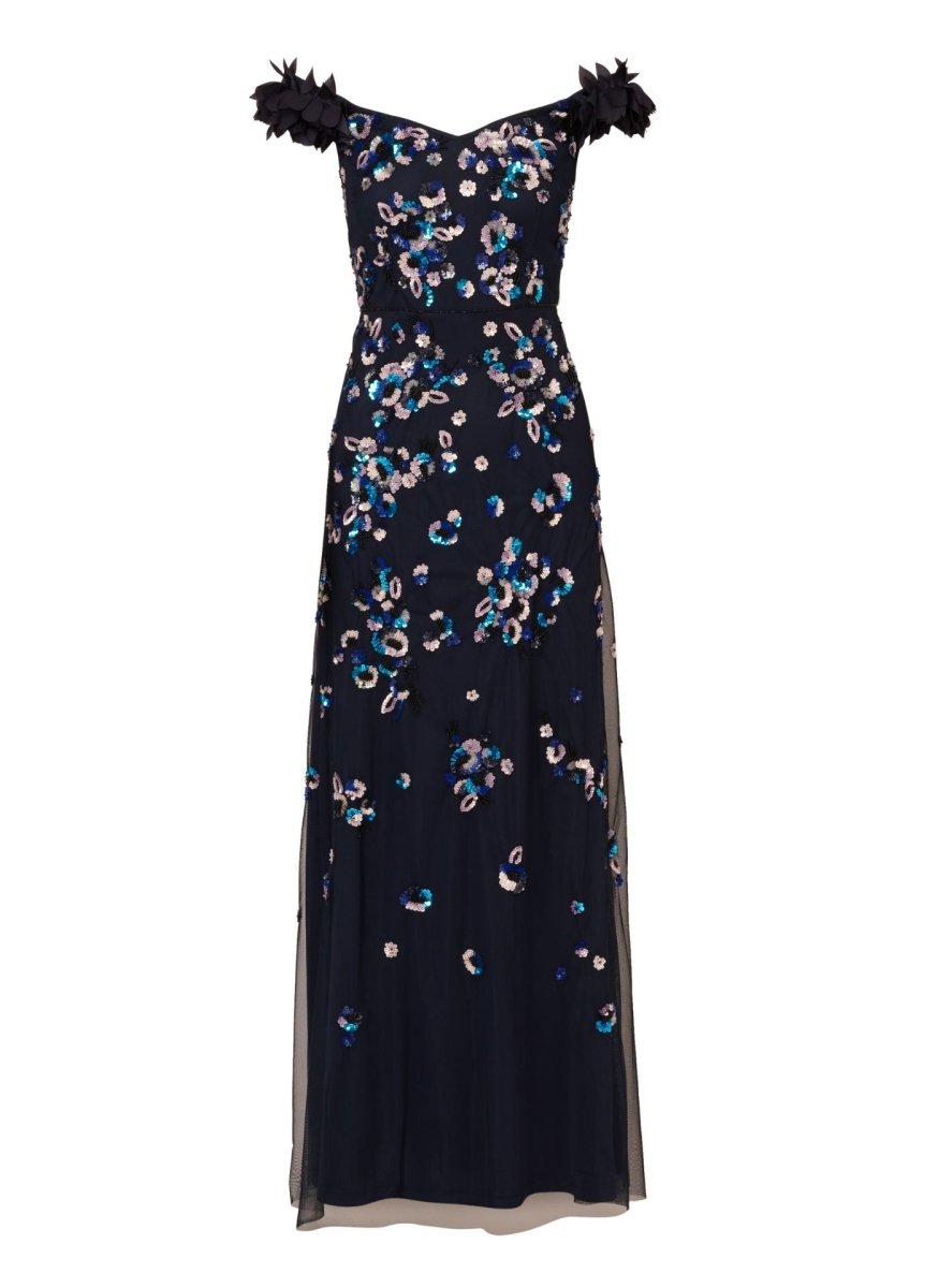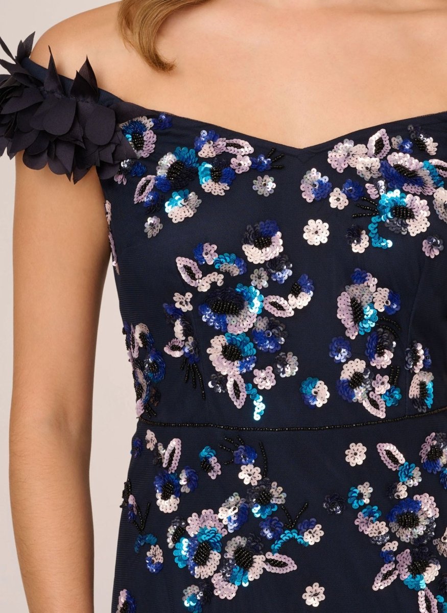 Betover met een onmiskenbare flair in deze adembenemende off-shoulder gala jurk. Het diepe midnight blauw wordt weelderig geaccentueerd door weelderige tulle, subtiel doorspekt met prachtige borduursels en glinsterende pailletten. Deze jurk omarmt je figuur met verfijning terwijl het de schouders elegant omlijst. Het geheel straalt een tijdloze allure uit die een onvergetelijke indruk achterlaat op elk galafeest, waarbij elke stap een dans van schittering en klasse wordt.