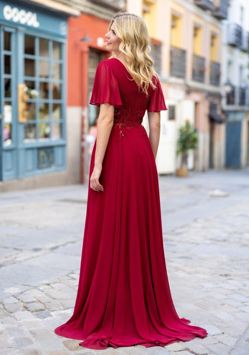 Laat jezelf stralen in deze elegante avondjurk in de levendige kleur Rio Red. Deze jurk ademt romantiek en vrouwelijkheid, perfect voor een feestelijke gelegenheid, een bruiloft of een chique diner.