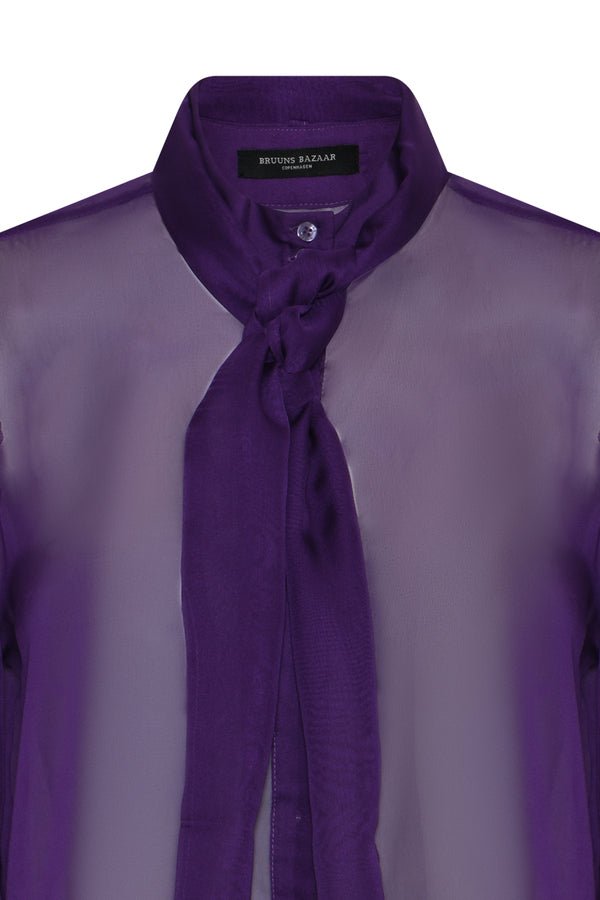 Deze verfijnde paarse blouse van Bruuns Bazaar straalt elegantie en vrouwelijkheid uit. Het luchtige, doorschijnende materiaal geeft de blouse een delicate uitstraling, terwijl de speelse striksluiting bij de hals voor een chique en tijdloos accent zorgt. De blouse heeft lange, licht geplooide mouwen met elegante manchetten en een doorknoopsluiting aan de voorzijde.
