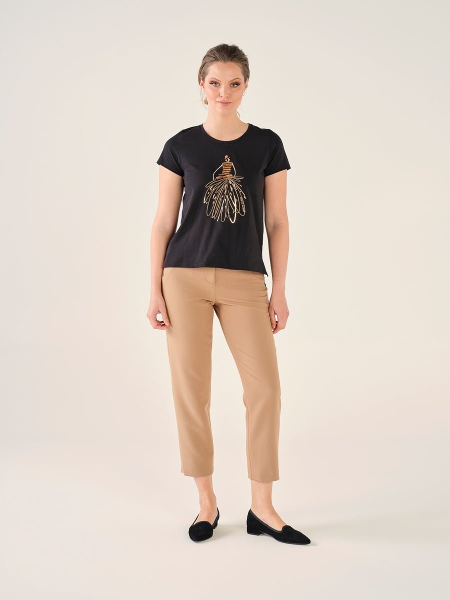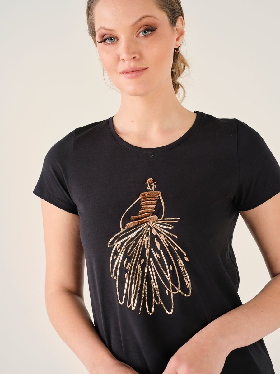 Deze stijlvolle top van Cristina Barros combineert eenvoud met een vleugje glamour. Het zwarte T-shirt is voorzien van een elegante gouden sequin print in de vorm van een stijlvolle jurk, waardoor dit item een echte blikvanger wordt.