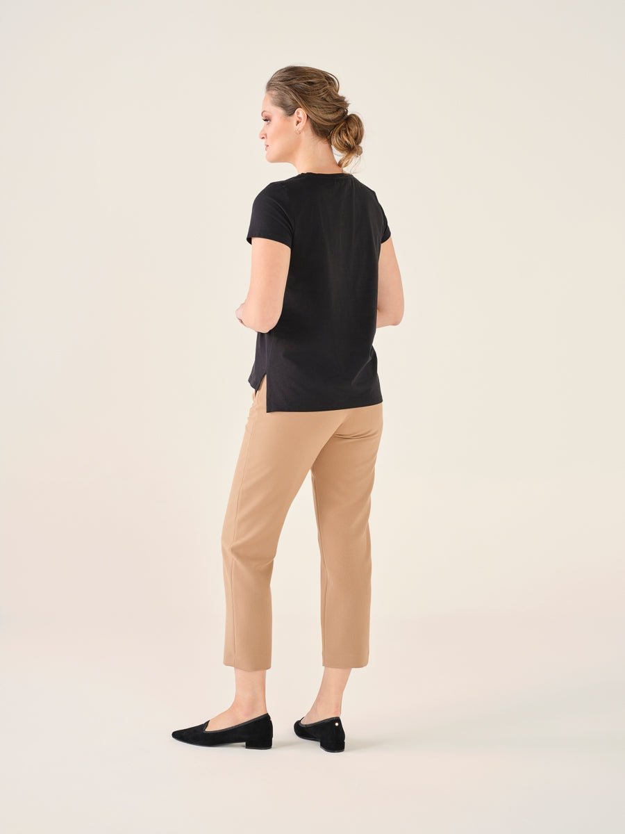 De top heeft een klassieke ronde hals en korte mouwen, waardoor hij comfortabel draagt en makkelijk te combineren is. De subtiele taillering zorgt voor een mooie pasvorm die zowel casual als chic gedragen kan worden.