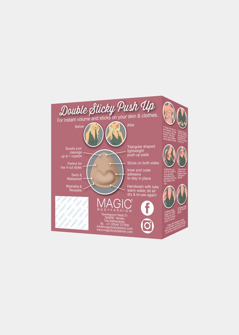 De Double Sticky Push-Up is een speciaal ontworpen triangel vormige push-up om mooie vormen te creëren in elke outfit. De cups zijn eenvoudig te plakken in je bh of bikini en zorgen voor een mooi push-up effect. Het mooie aan deze cups is dat deze aan beide zijden plakt voor extra zekerheid. In het doosje zit 1 paar welke meerdere keren gebruikt kan worden.