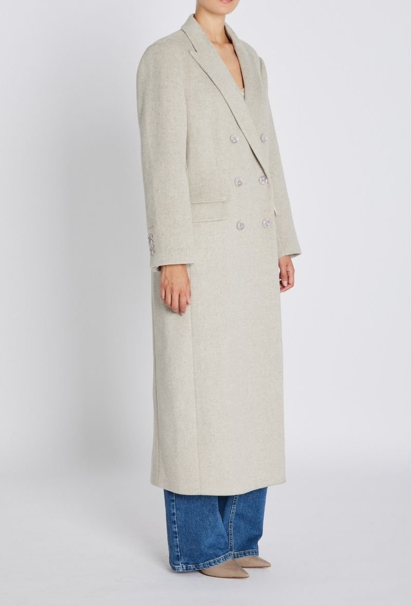 De mantel heeft een klassieke reverskraag, twee rijen knopen in een subtiel ton-sur-ton ontwerp, en klepzakken voor een verfijnde afwerking. De rechte, lange pasvorm creëert een gestroomlijnd silhouet dat moeiteloos chic oogt – ideaal over zowel formele als casual outfits.